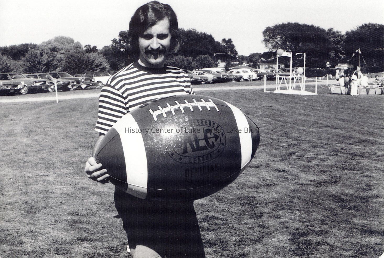 Person holding large football stands in field. Photographs relating to Lake Forest Hospital collected for the 100th Anniversary of the Hospital by the Development Department.