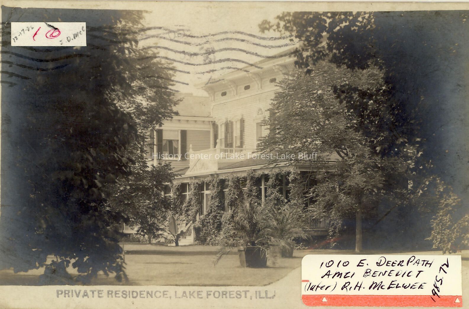 1010 East Deerpath owners Amzi Benedict; R.H. McElwee builders possibly were Russell Brothers 1860 destroyed by fire in 1975, when owned by the Salisbury family 810 Lake Road servants' quarters postmarked 1907