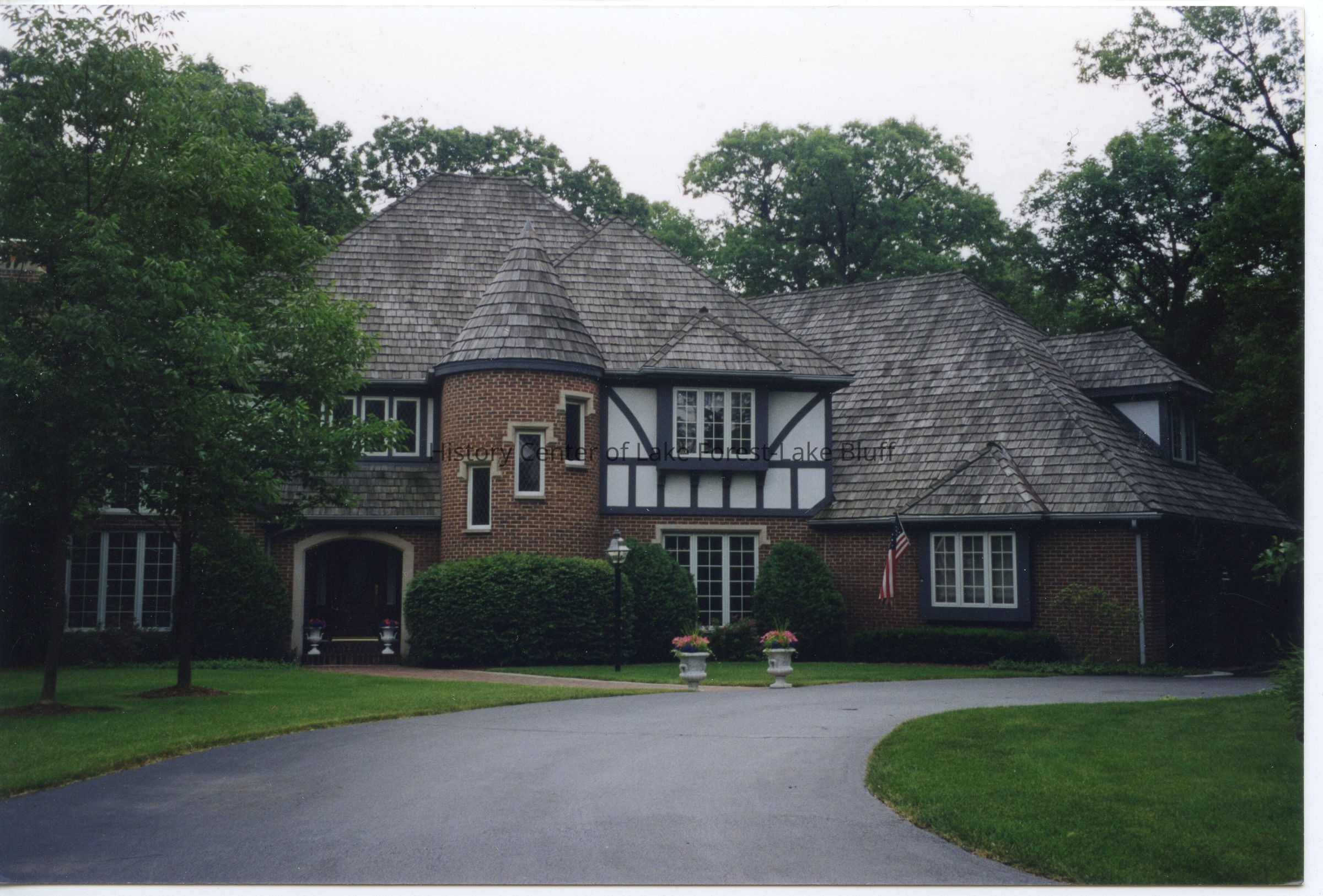 Color photograph of the exterior of 1085 Ashley. Tudor style with turret. Baird & Warner.