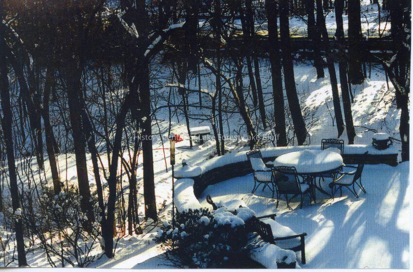 Exterior of 1119 Sheridan Road. Color photograph printed on paper. Winter view of patio and wooded area.