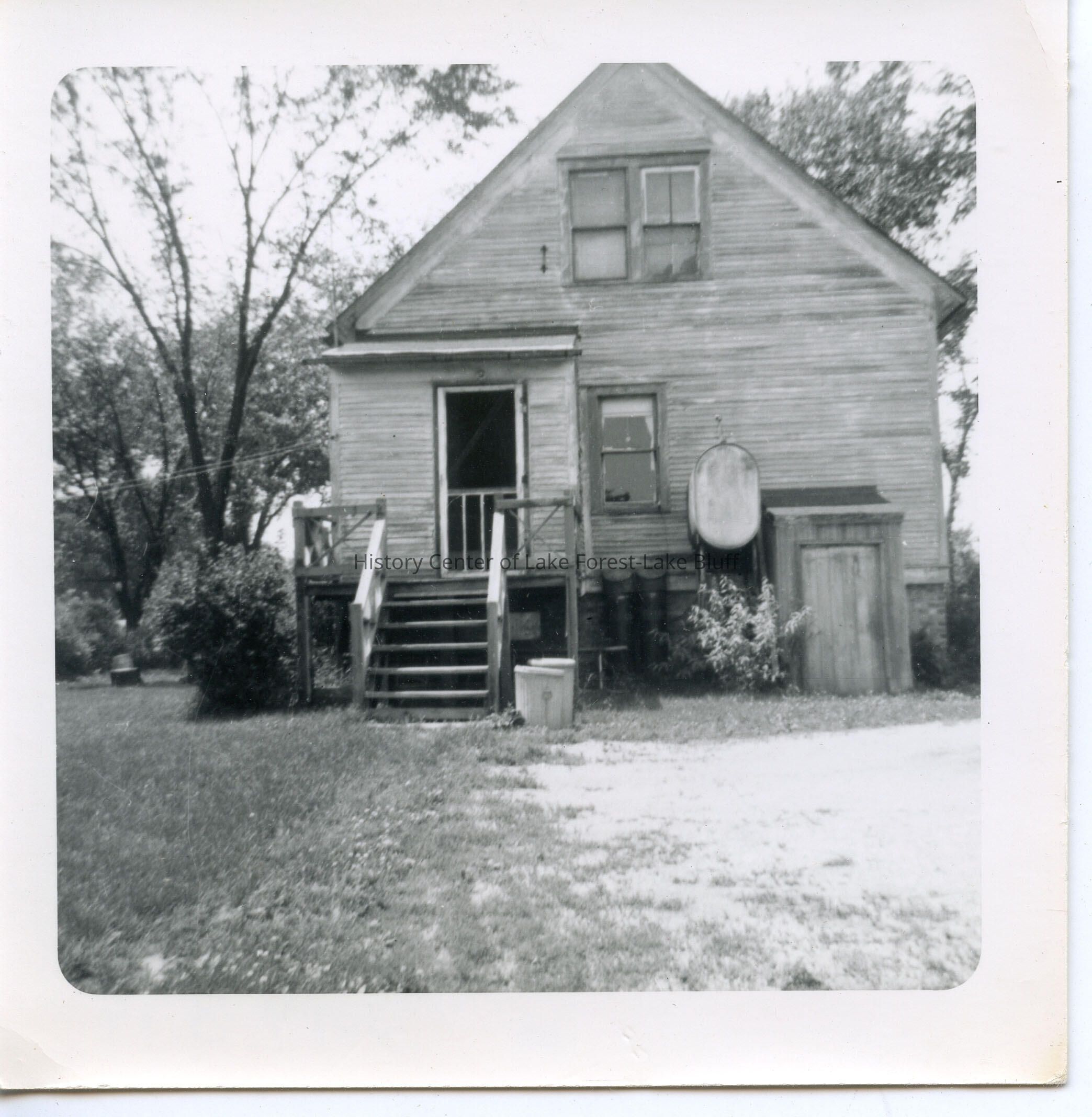 Black and white photograph of farm house at 1227 South Waukegan Road lived in by Mathilda Zieman Greene. Likely rear view. Real estate records indicate the house was owned by Mathilda's parents.