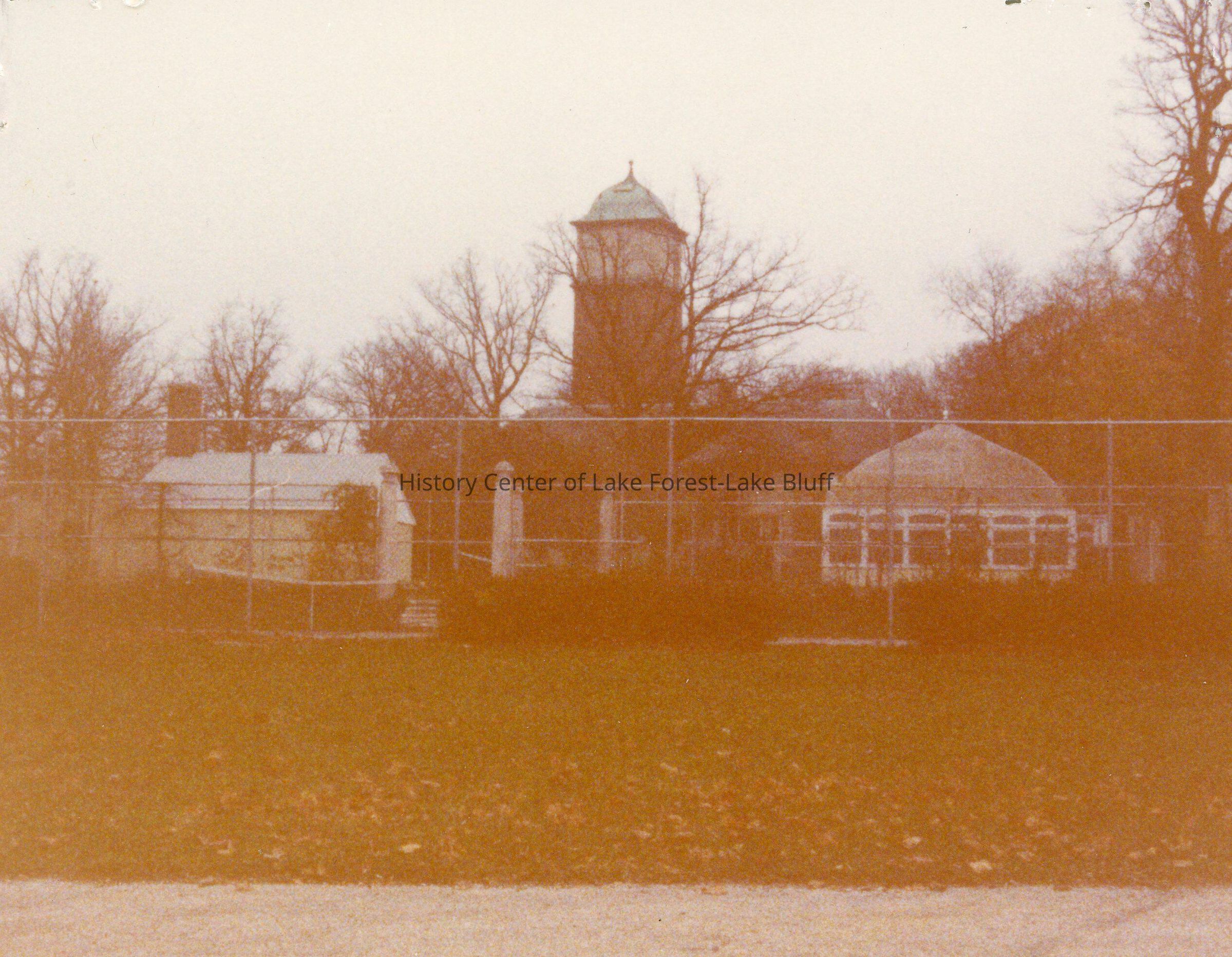 136 Green Bay Rd. "Stonebridge" view of carriage house tower and greenhouse - William V. Kelley estate. Architect: Howard Van Doren Shaw Landscaping: Jens Jensen no date given