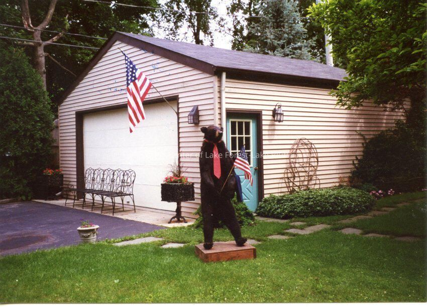Garage at 139 Woodland Road. David O'Neill's stuff bear. July 2000.