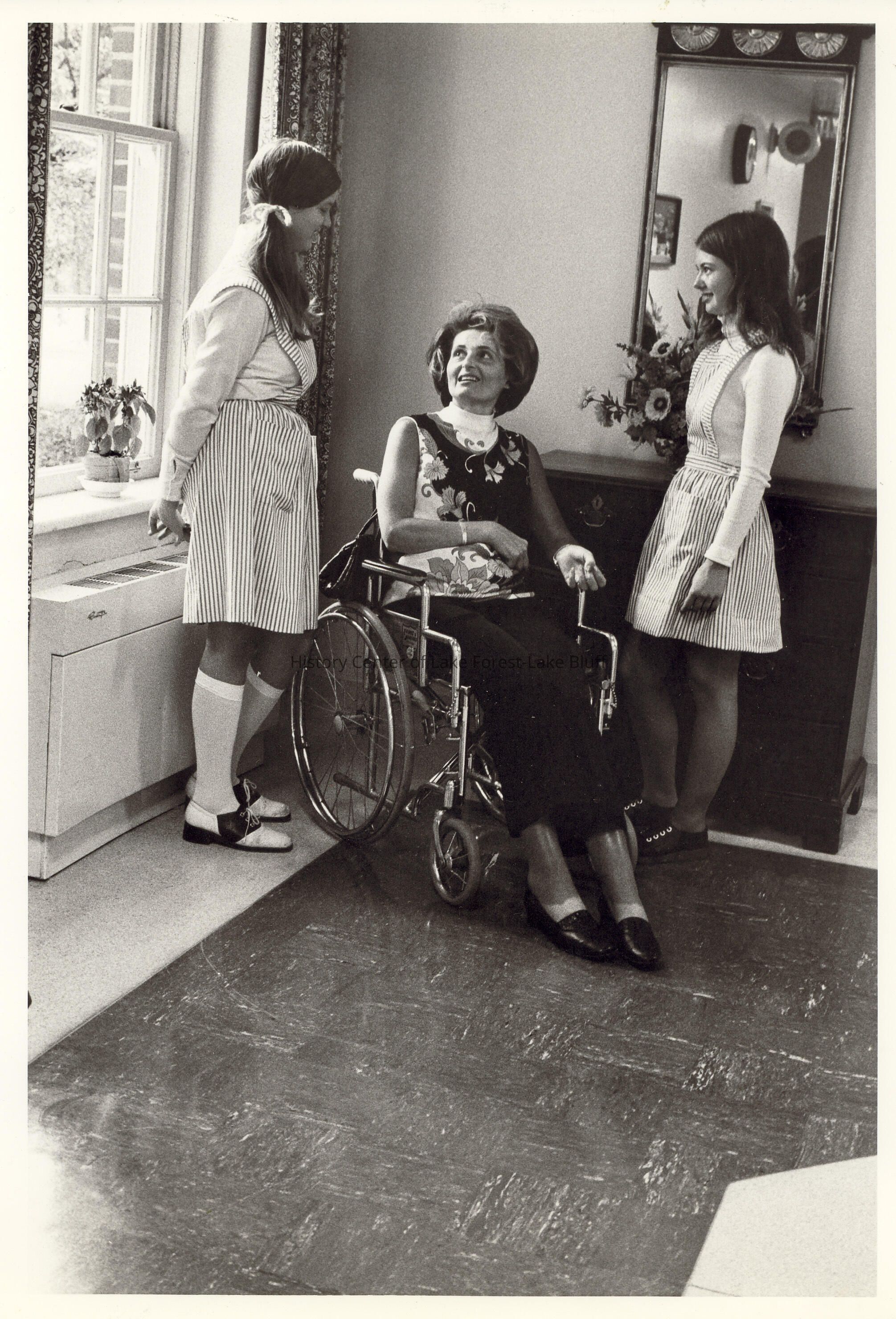 Two Candy Stripers talking to patient in wheelchair.