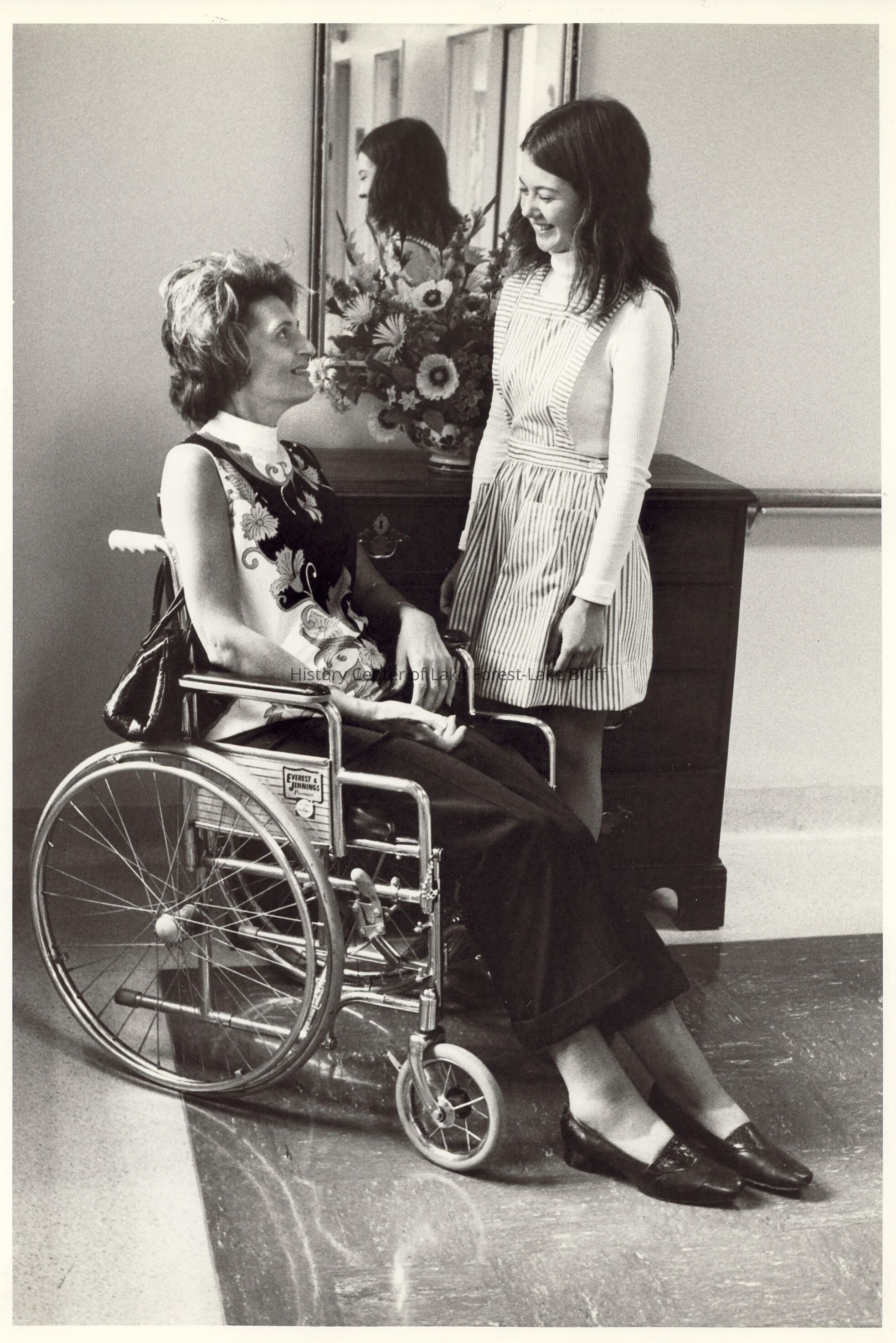 Candy Striper talking to patient in wheelchair.
