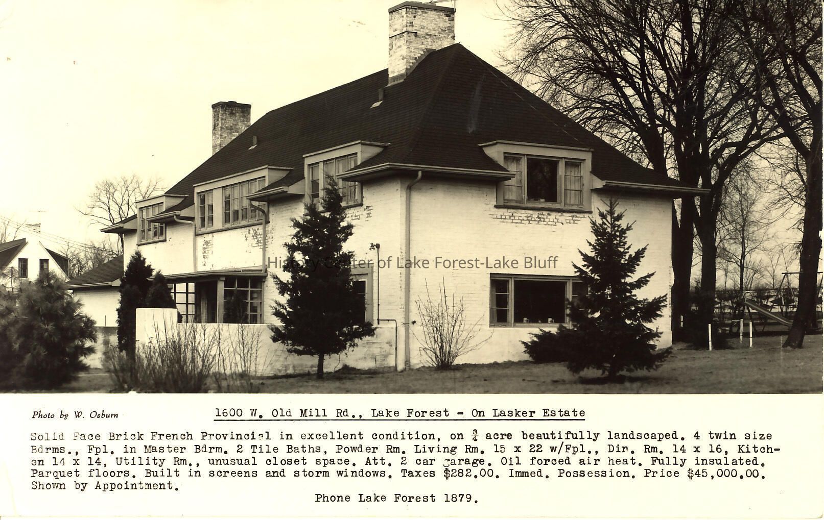 1600 West Old Mill Road Lake Forest Mill Road Farm Albert Lasker estate realty listing on a postcard