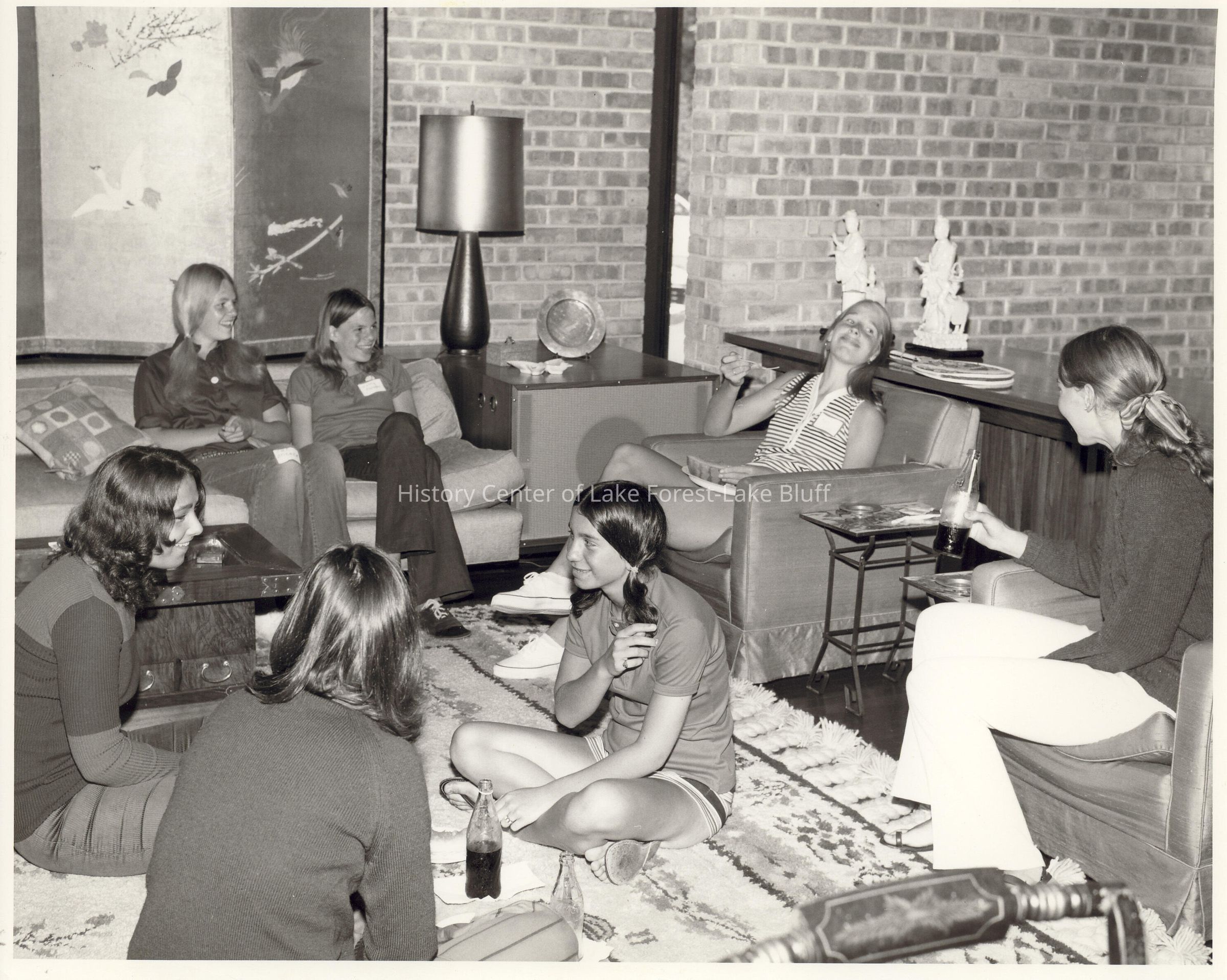Seven Candy Stripers, not in uniform, relaxing and enjoying soft drinks.