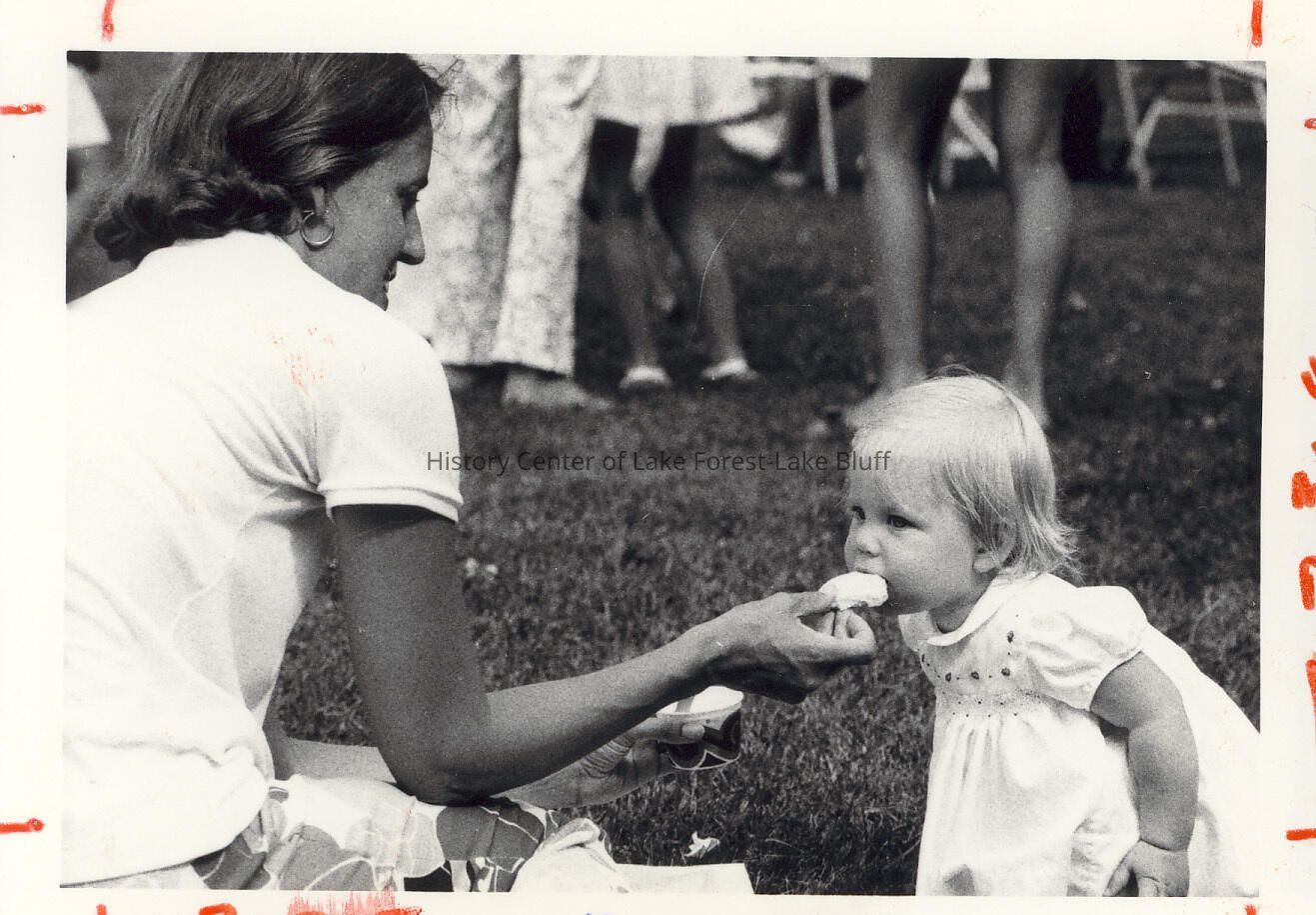 Lawn setting. Karen McGovern feeding cookie to young girl. Presumably Baby Alumnae party.