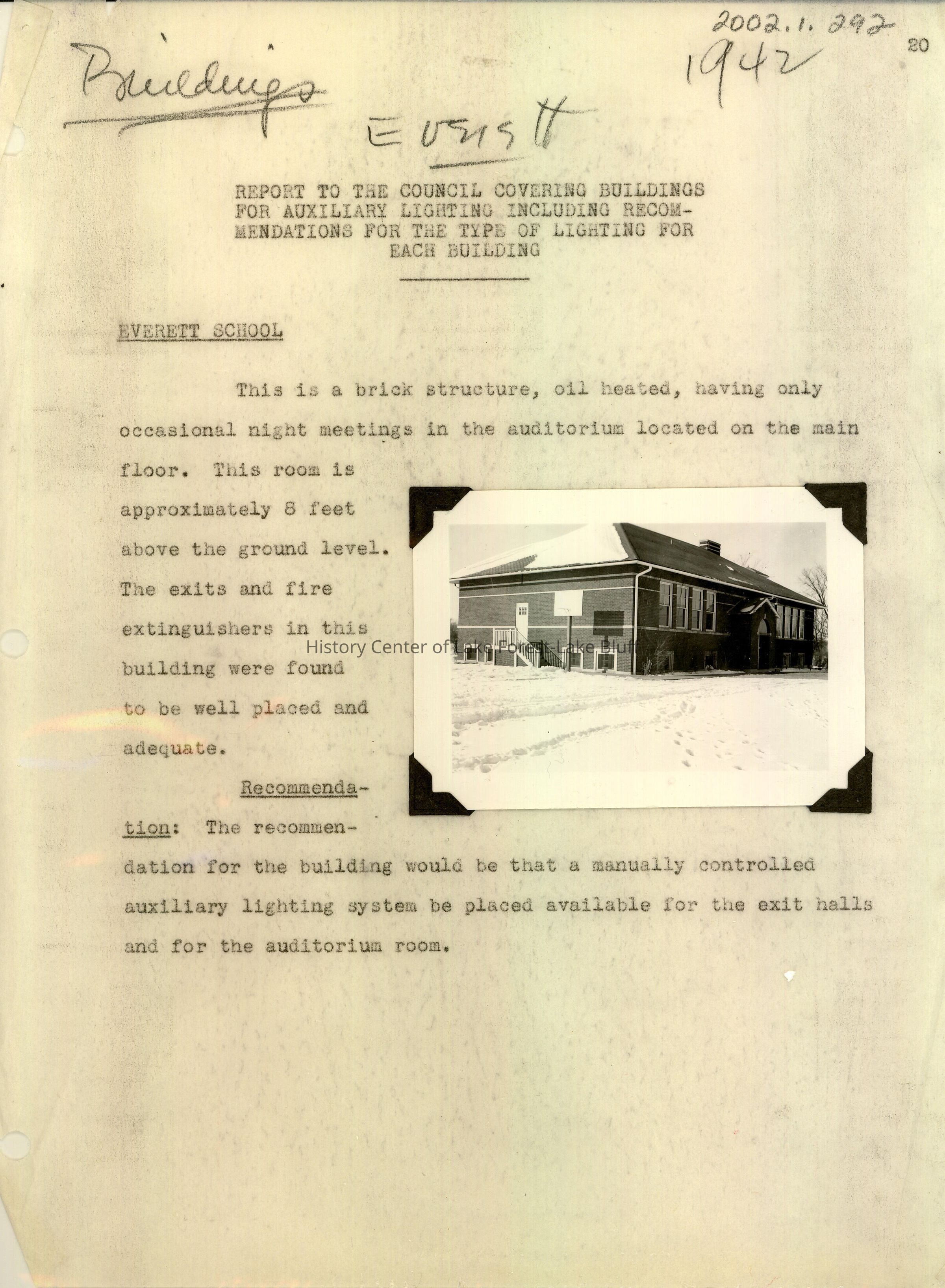 Report to the Council covering buildings for auxiliary lighting including recommendations for the type of lighting for each building, includes a picture of Everett School, back and side view.