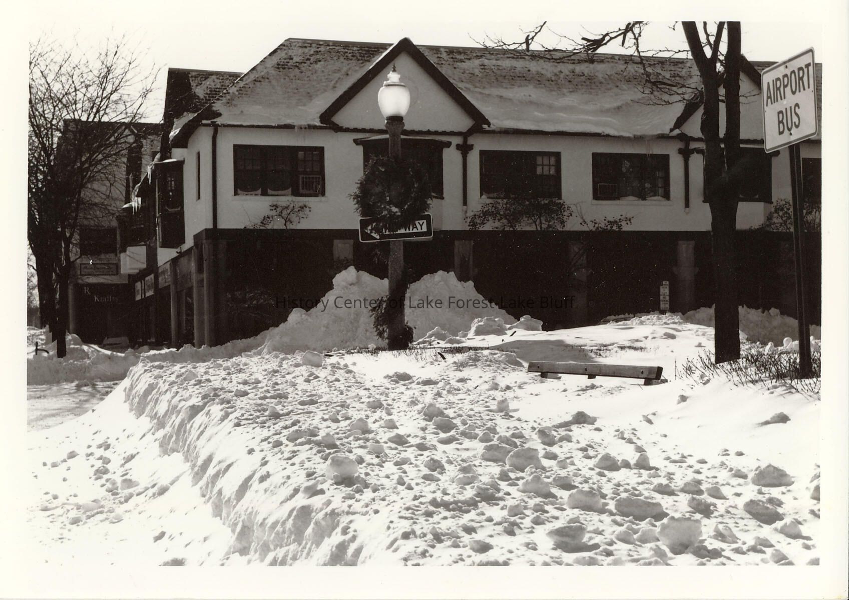 Photograph of the Airport Bus stop on Western Avenue under heavy snow. Taken after the blizzard of January, 1979. Krafft's Drug Store, Swiss Colony are visible