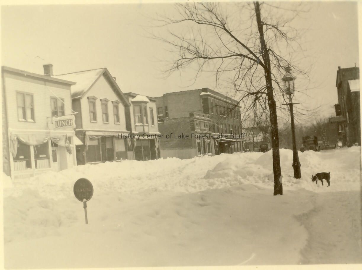 200 block of East Deerpath looking east on Deerpath signs of businesses showing are Lunch, The Lake Forester, Laundry, Anderson building