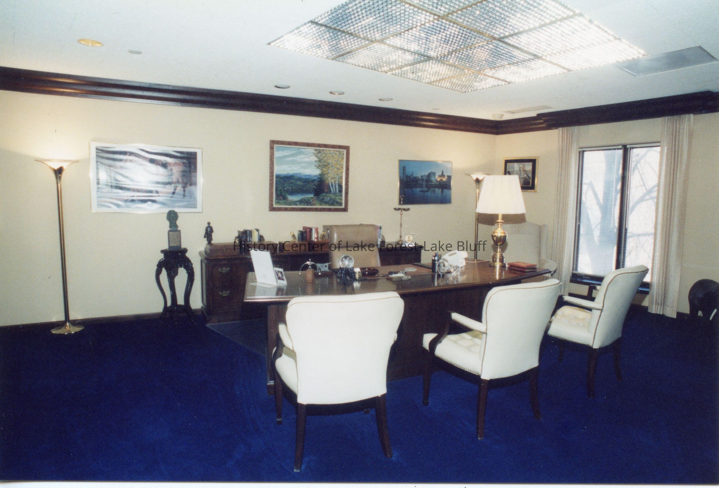 Interior photograph of W. Clement Stone office at 207 Westminster showing desk and three visitor's chairs. Color photograph.
