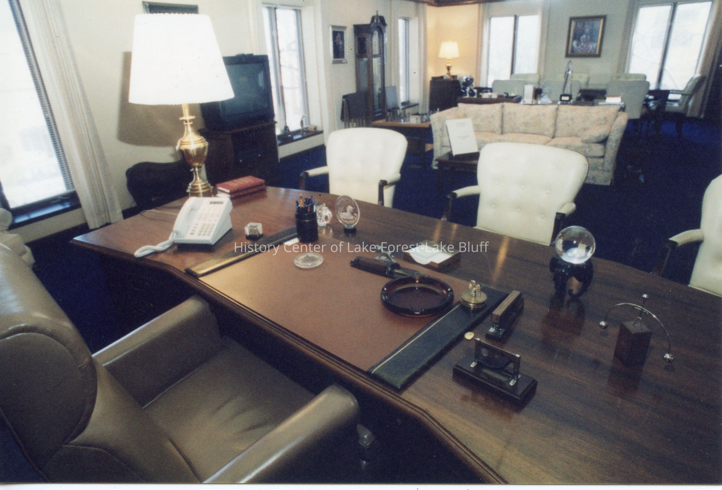 Interior photograph of W. Clement Stone office at 207 Westminster. Close up of desk from behind. Color photograph.
