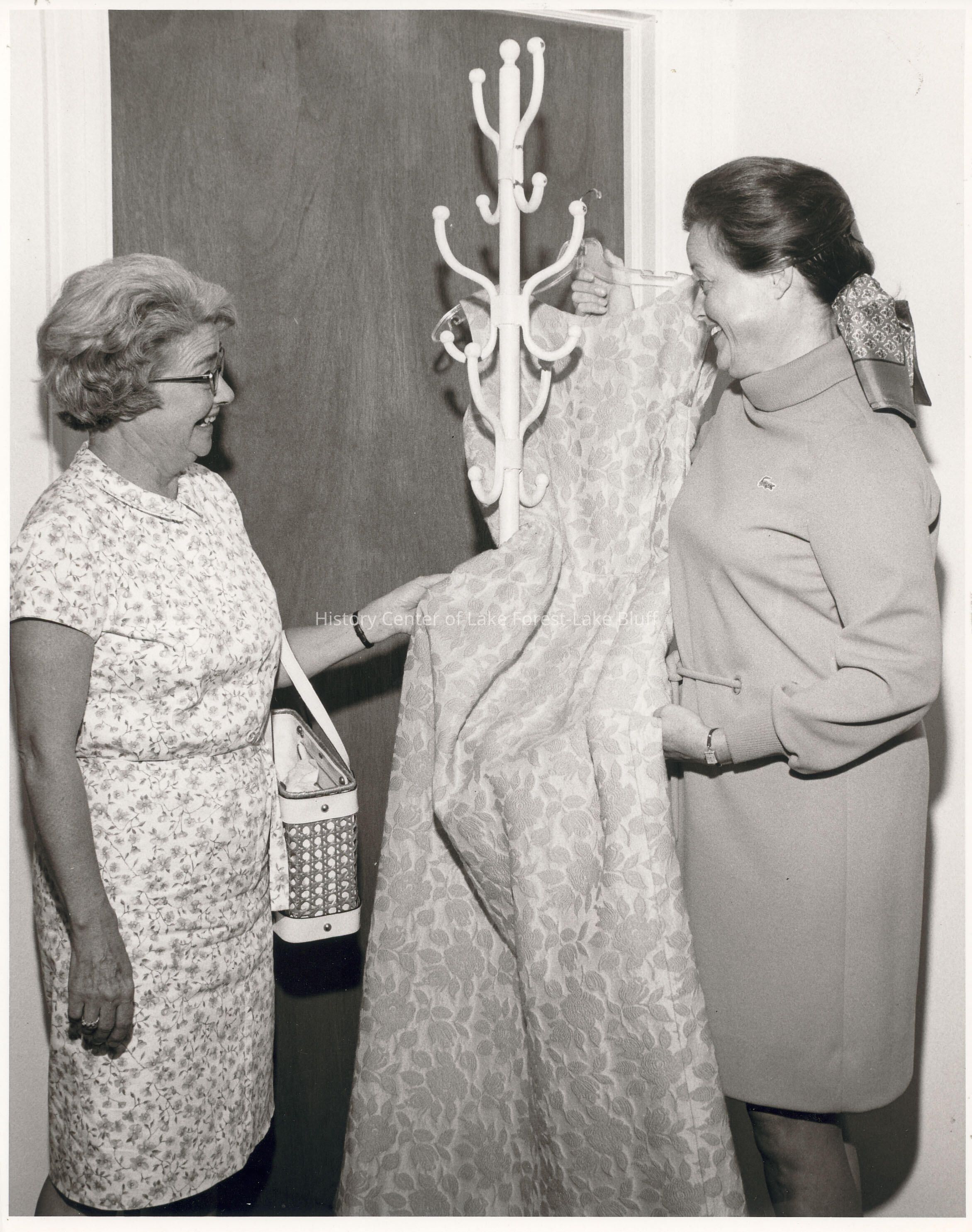 Women's Auxiliary: Two women holding long dress, presumably at rummage shop.