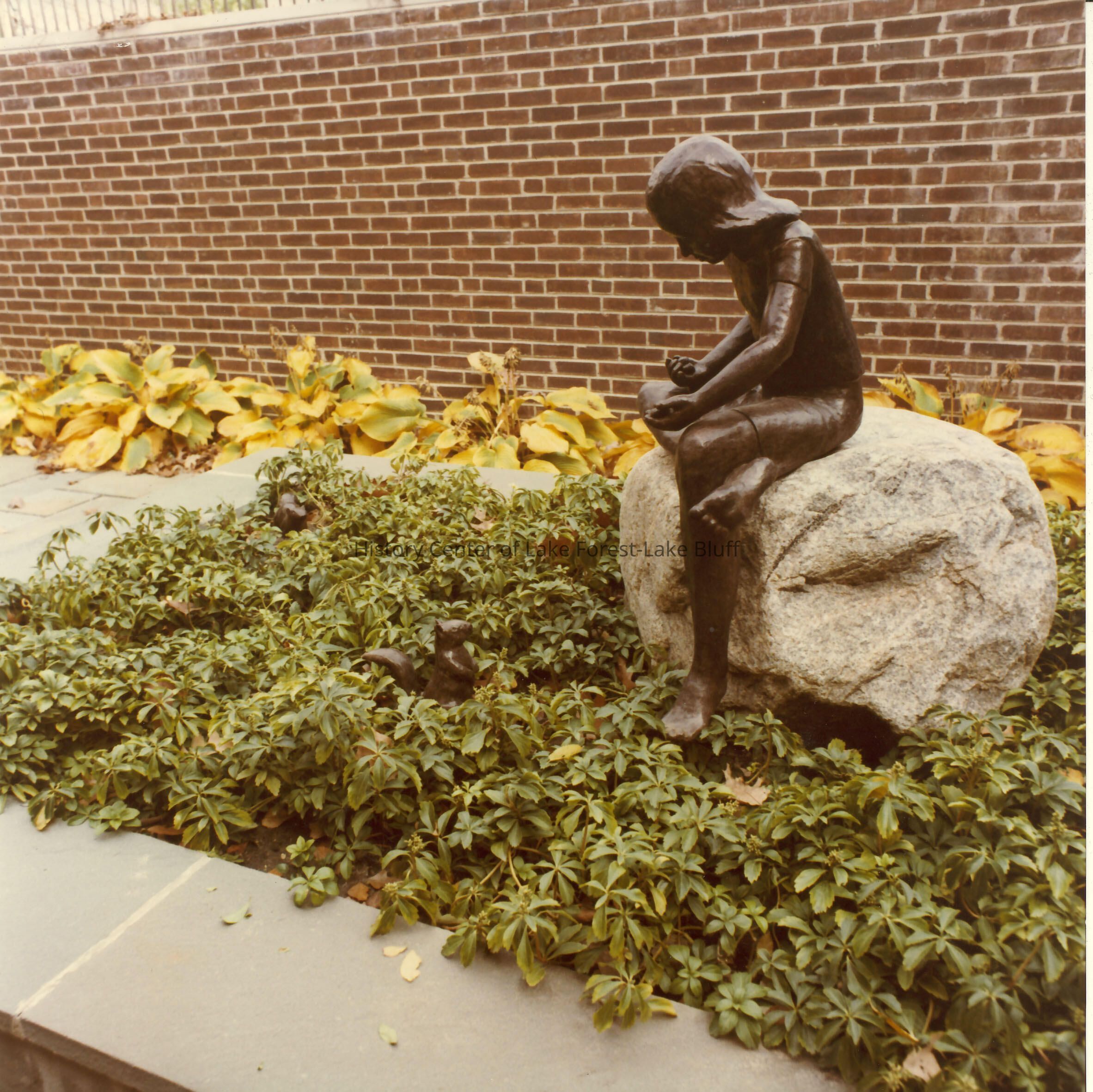 Girl Feeding Three Squirrels. Bronze statue of a girl sitting on a rock looking down at her hands. brick wall in background. Sculpted by Dorothy Hobbs Boehm, given in memory of Louise Wells Kasian, former library administrator. Installed at the library in 1979. The artist had a studio called "The Clay Pigeon"