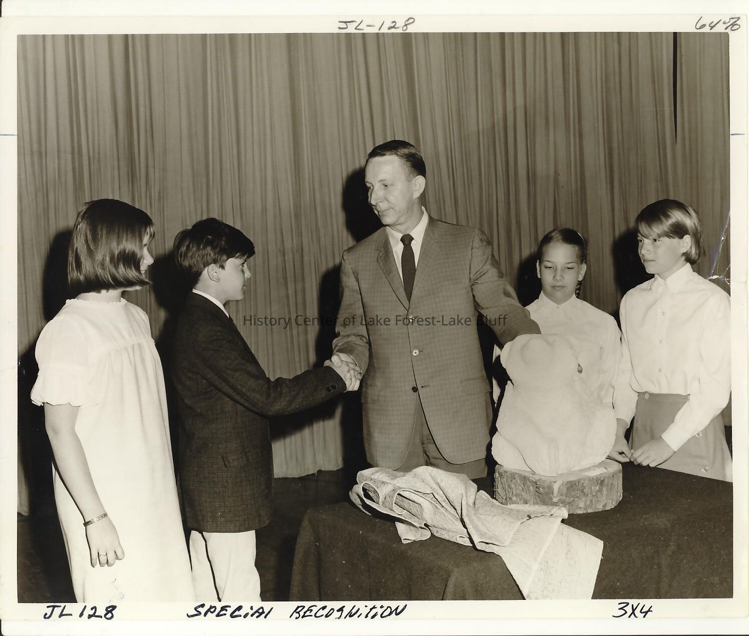 black and white image of school presentation by students to Mr. Bill Mortenson, principal of Deerpath School please credit Barry Fitzgerald and reproduced by Jean McMaster Grost