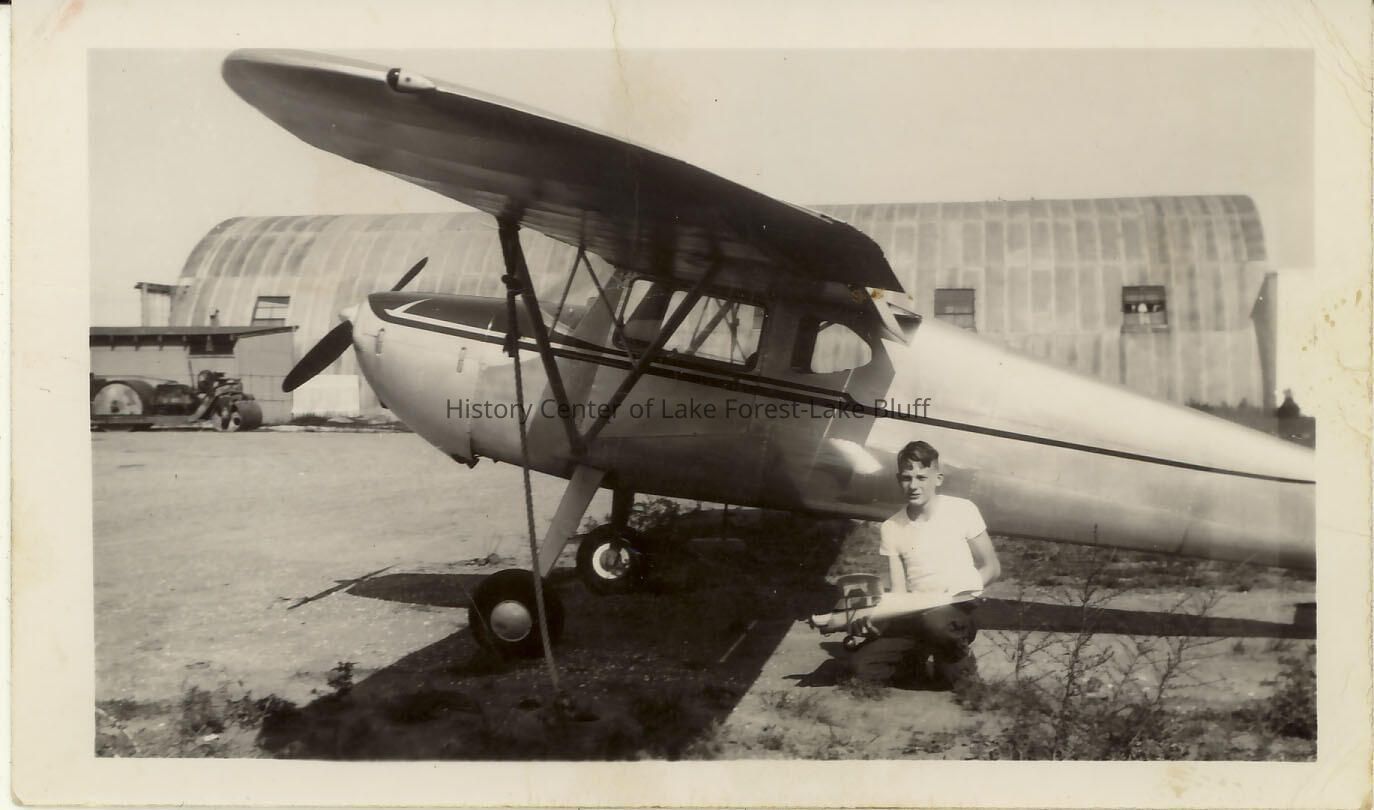 Black and white image of Stanley Wells, Jr. with full size airplane. 1940s.