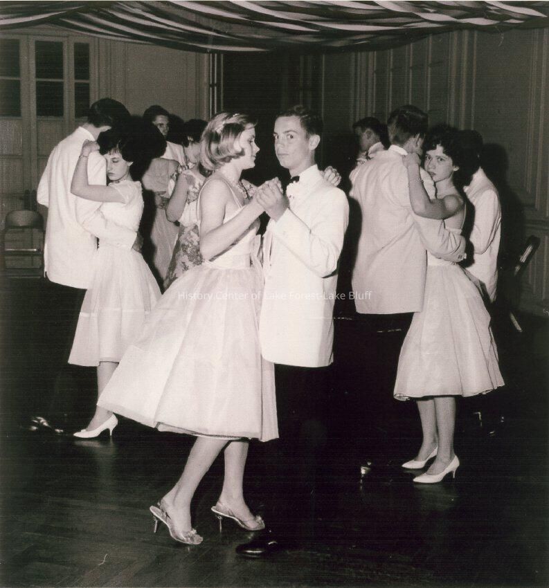 Unidentified group of young women and men at a Ferry Hall formal dance. Black and white image, circa 1950.