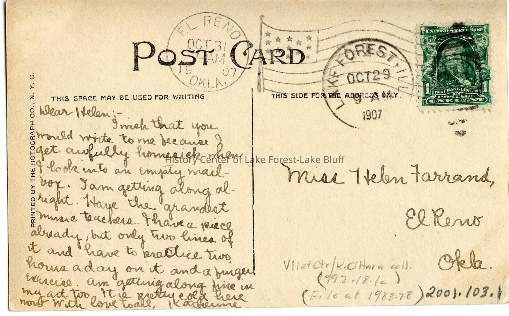 Postcard of Forest Park Beach. Dated October 29, 1907. Written from Katherine to Miss Helen Farrand in Oklahoma. Note mentions music and art lessons and the cold weather.