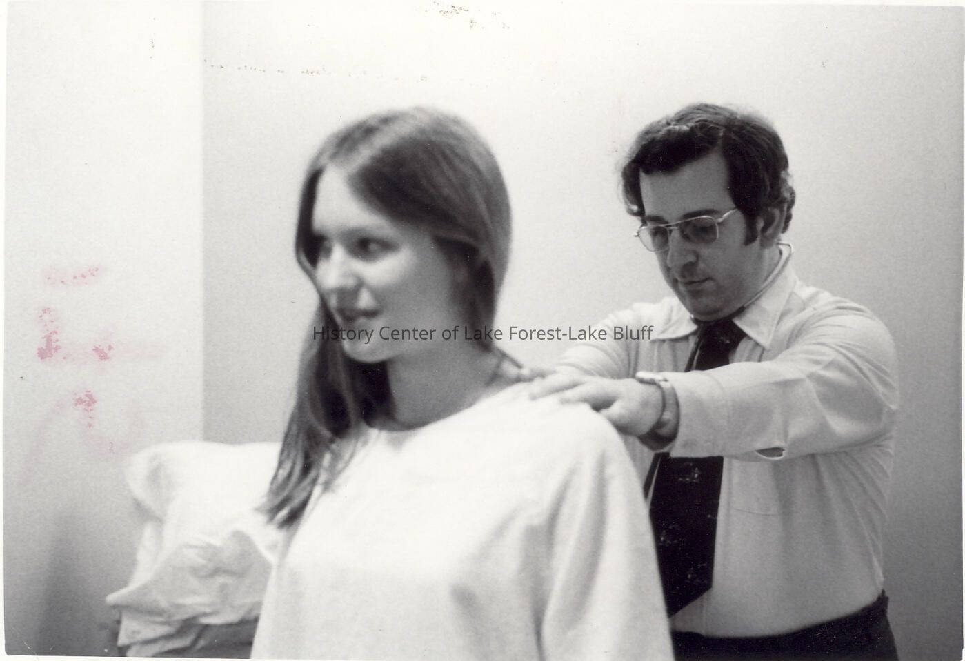Male doctor appears to be examining the back of a young female patient who is standing in front of him.