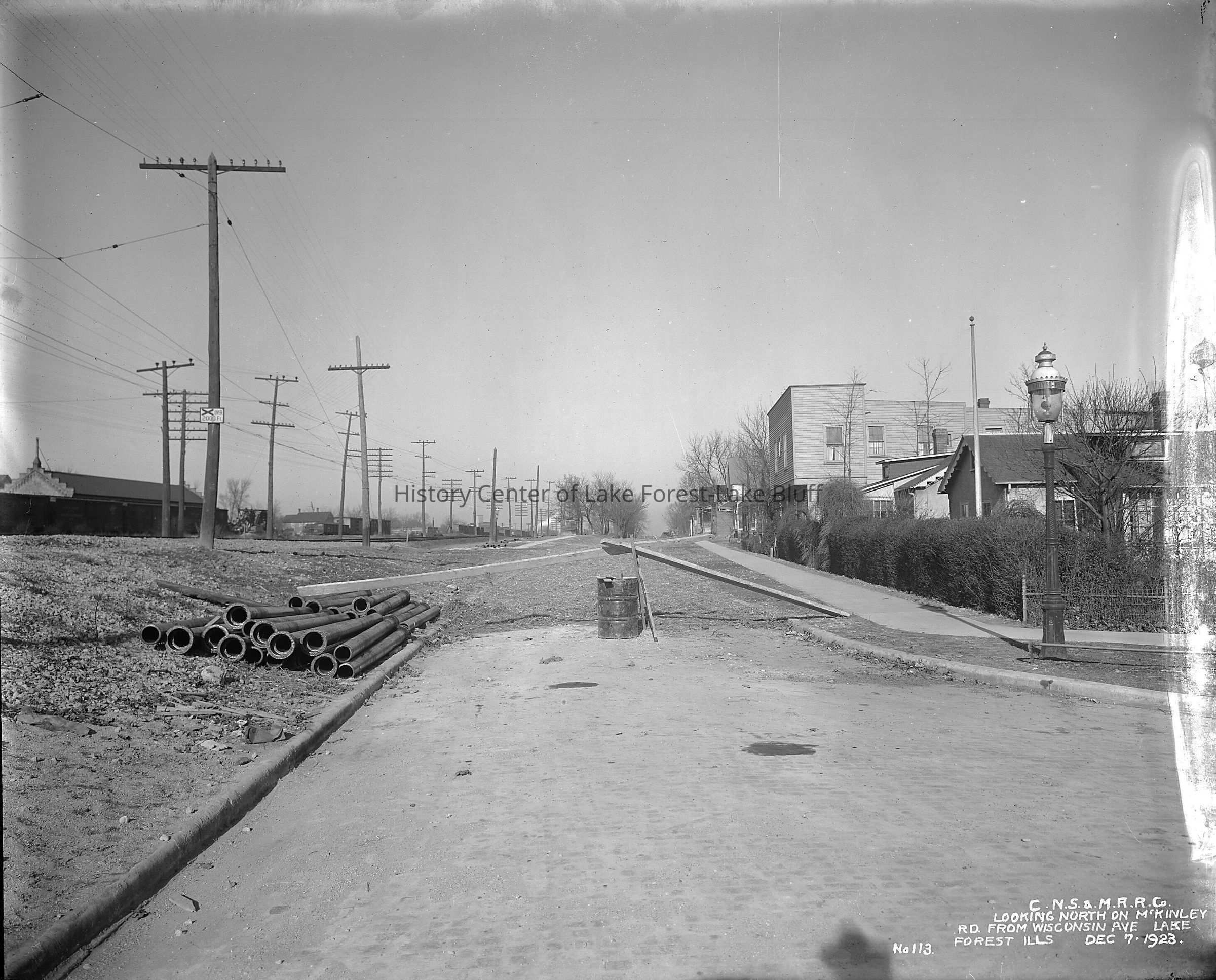 Chicago, North Shore & Milwaukee Railroad Looking north from Wisconsin Avenue on December 7, 1923, the work on the new McKinley Road appears to be nearing completion. images are also on a CD (1982.3.1 - 1982.3.29)