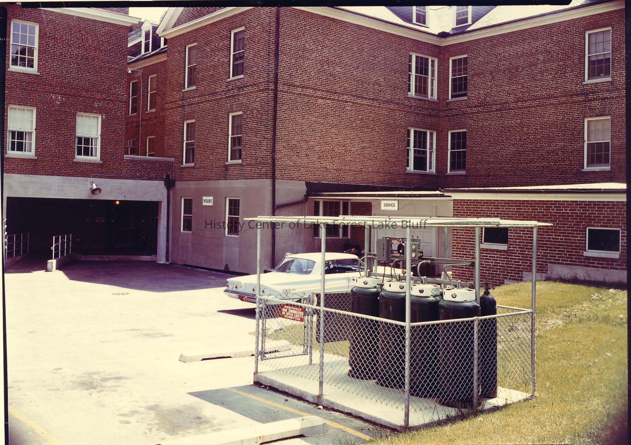 Back of the hospital showing Emergency and Service entrances.