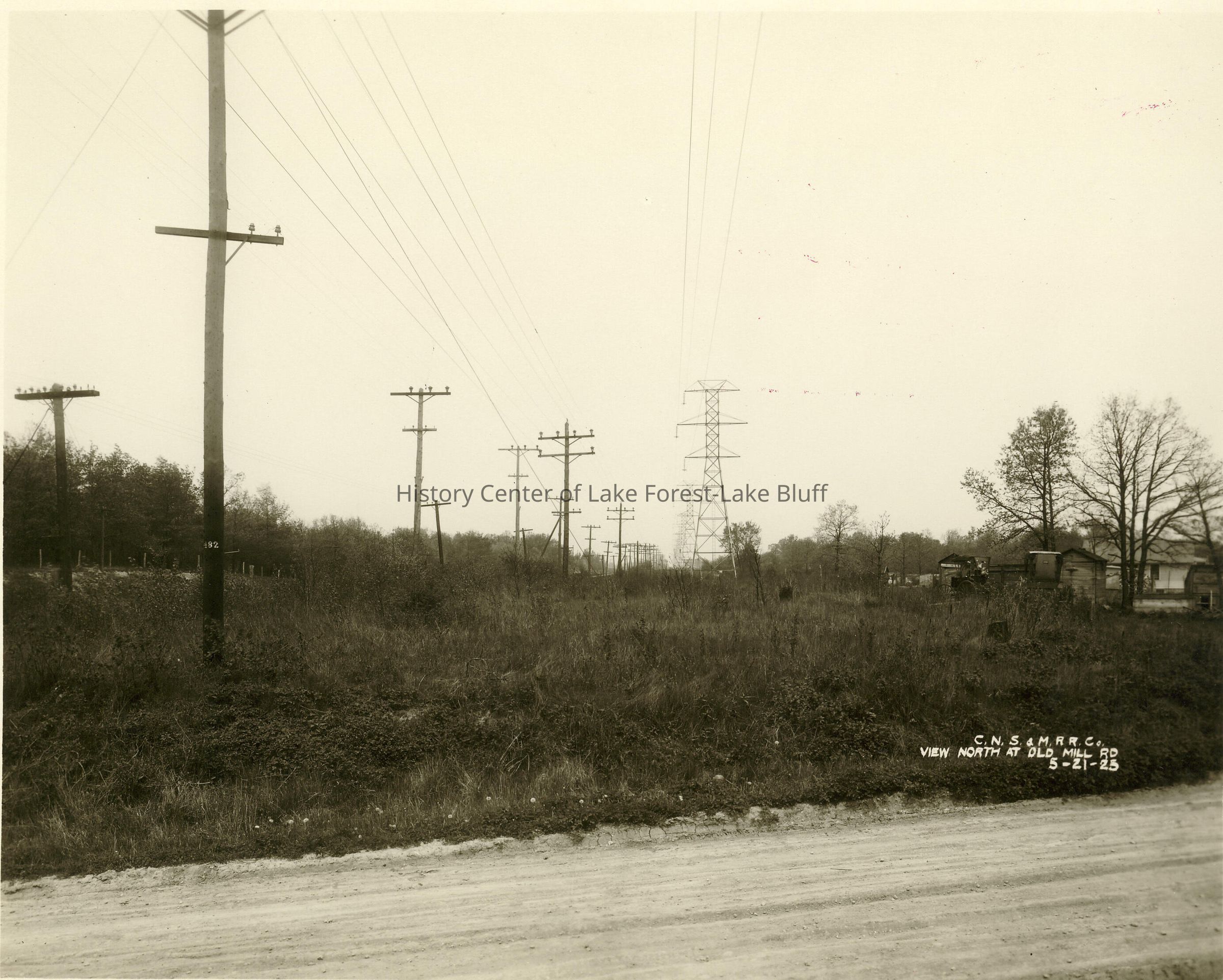 original property of North Shore Line Advertising Dept., Chicago View north at Old Mill Road in west Lake Forest C.N.S & M.R.R., Co. 5-21-1925