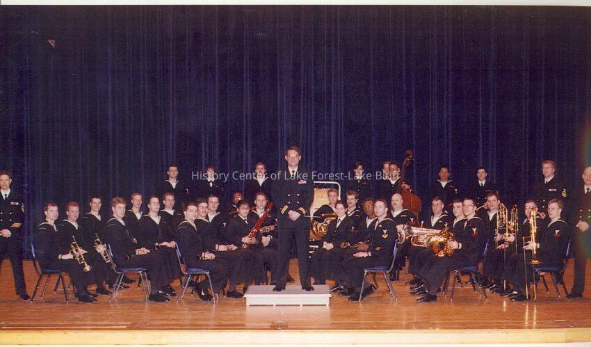 Group picture of the Great Lakes Navy Band in front of a blue curtain- color image