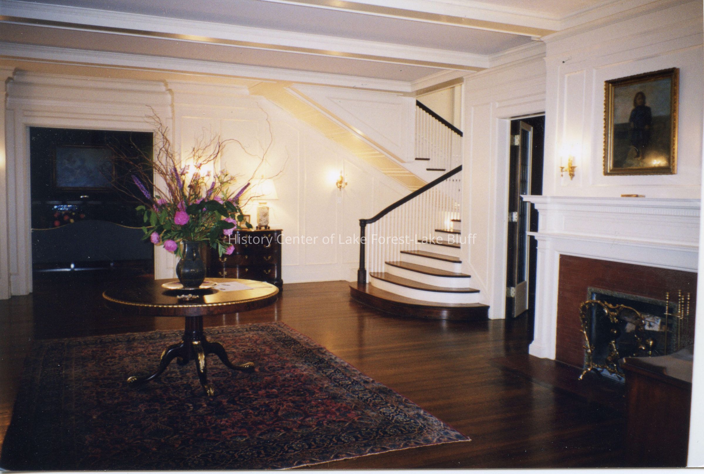 Color photograph of interior of 360 Mayflower. Possibly the foyer. Staircase and fireplace are visible.