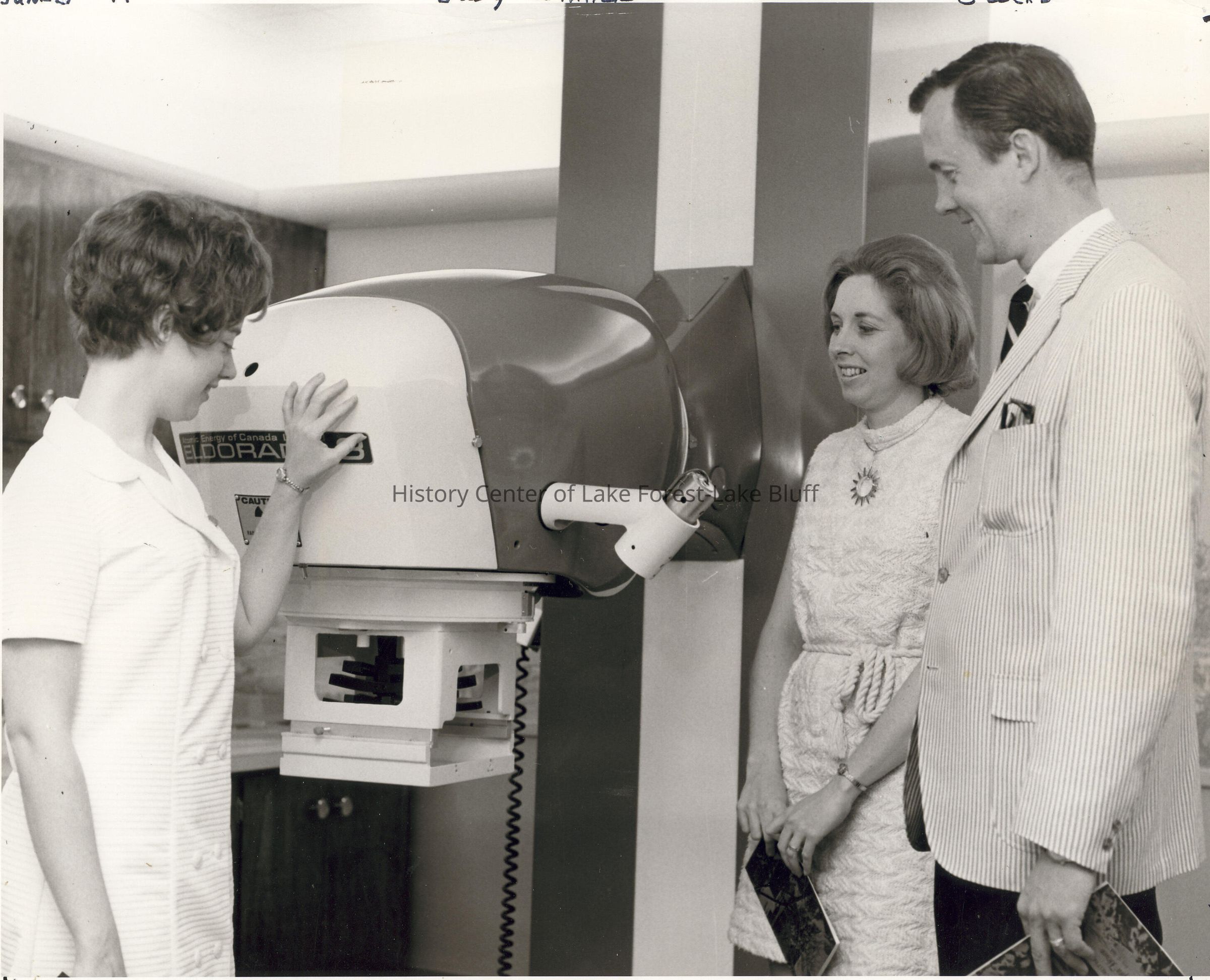 Man in suit and woman in dress with female technician looking at x-ray machine.