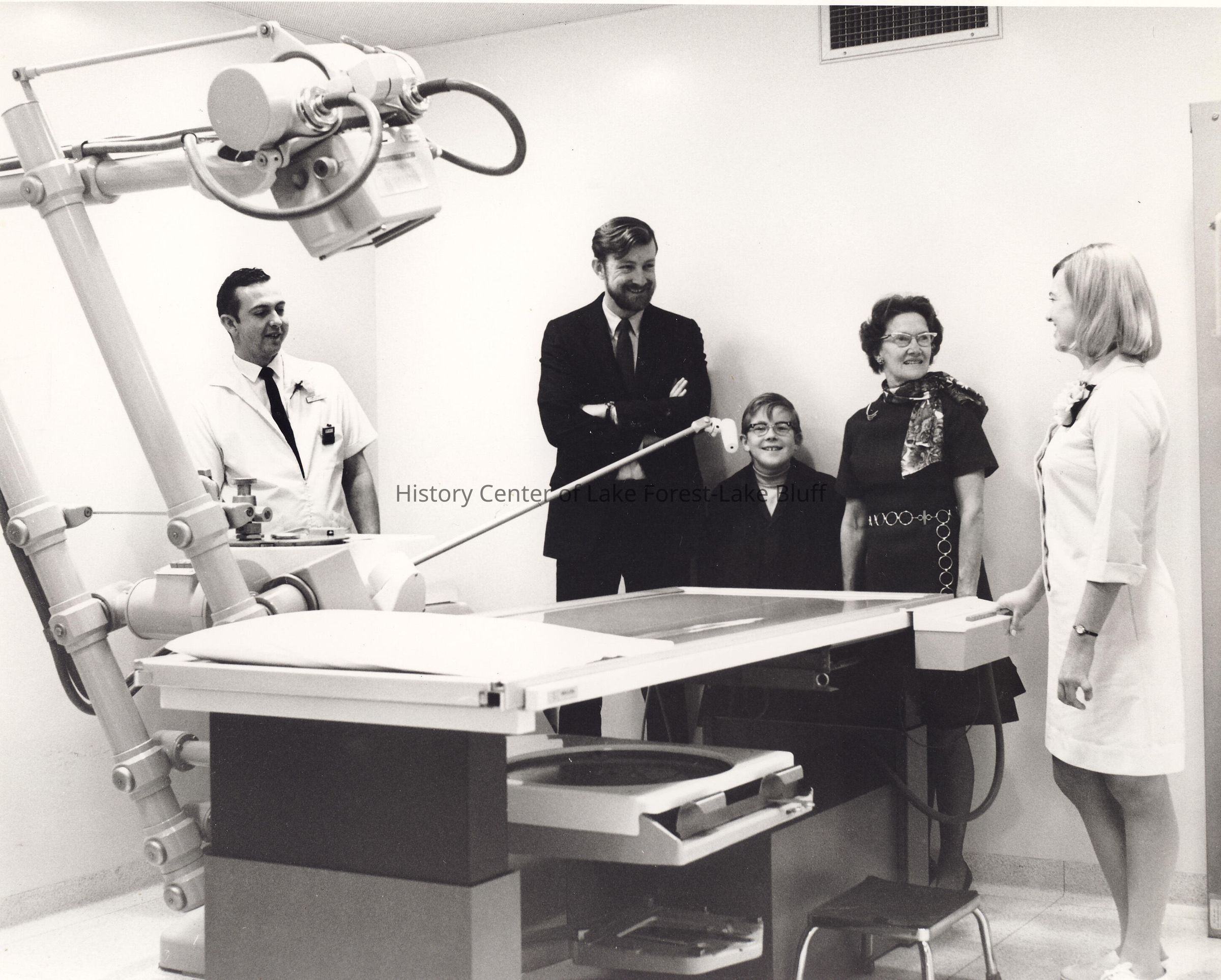Male and female clinician showing x-ray equipment to man, woman and an adolescent.