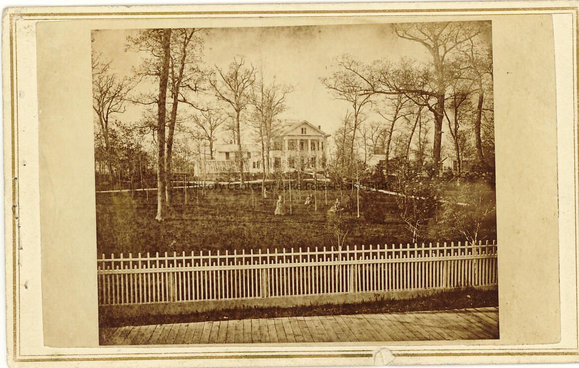 This is the original of the many copies we have. Taken from the road, the white fence is in the foreground. Several ladies and gentlemen are scattered on the lawn with the house in the background.