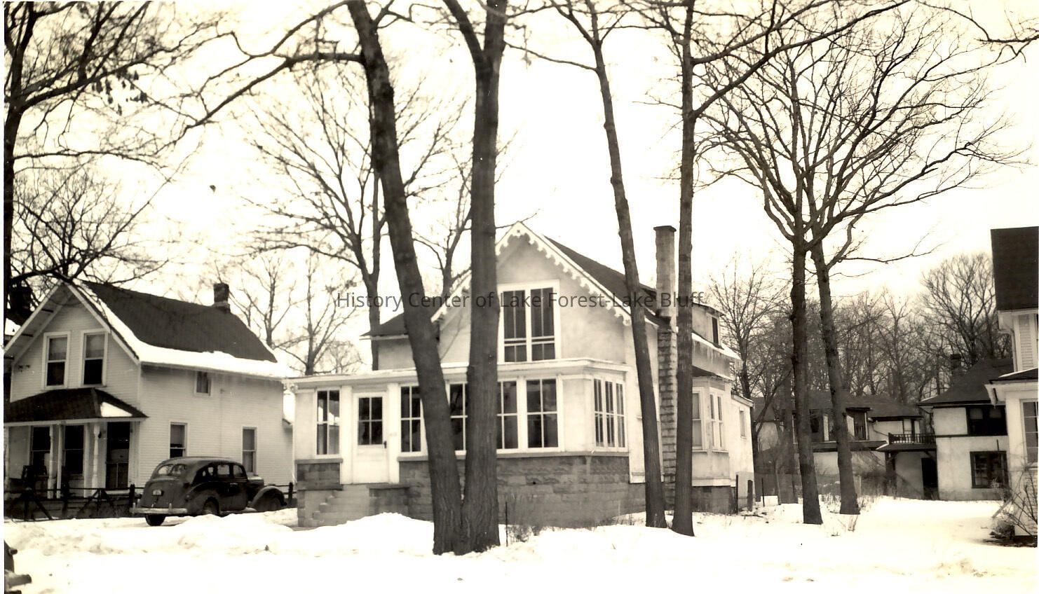 Black and white photograph of two houses on Prospect Avenue in Lake Bluff during the winter.