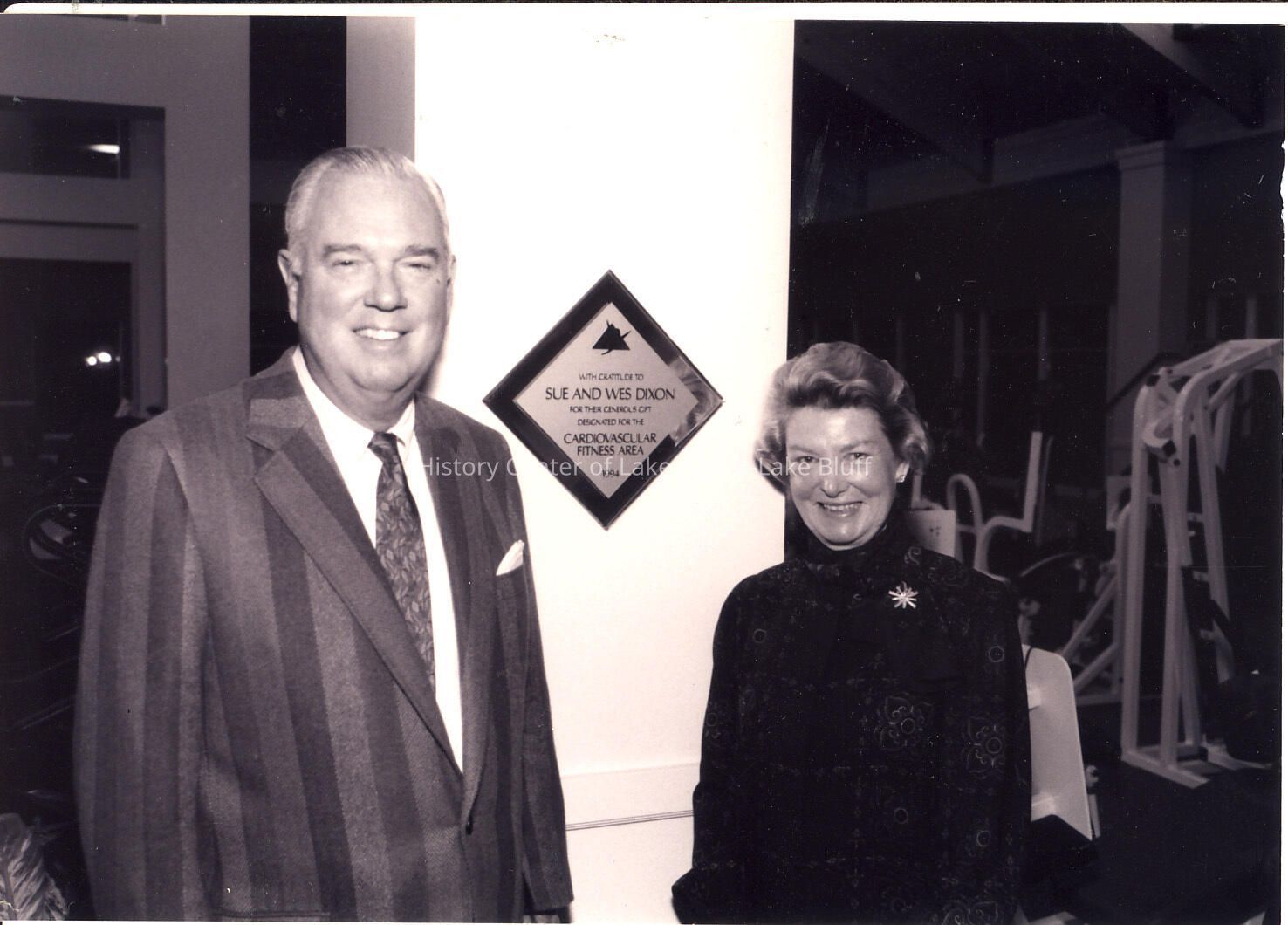 Sue and Wes Dixon standing in front of the Cardiovascular fitness area they donated to the Lake Forest Health and Fitnes center. Photo taken at the Pillars annual dinner held and the LF Health and Fitness center in January 1994.