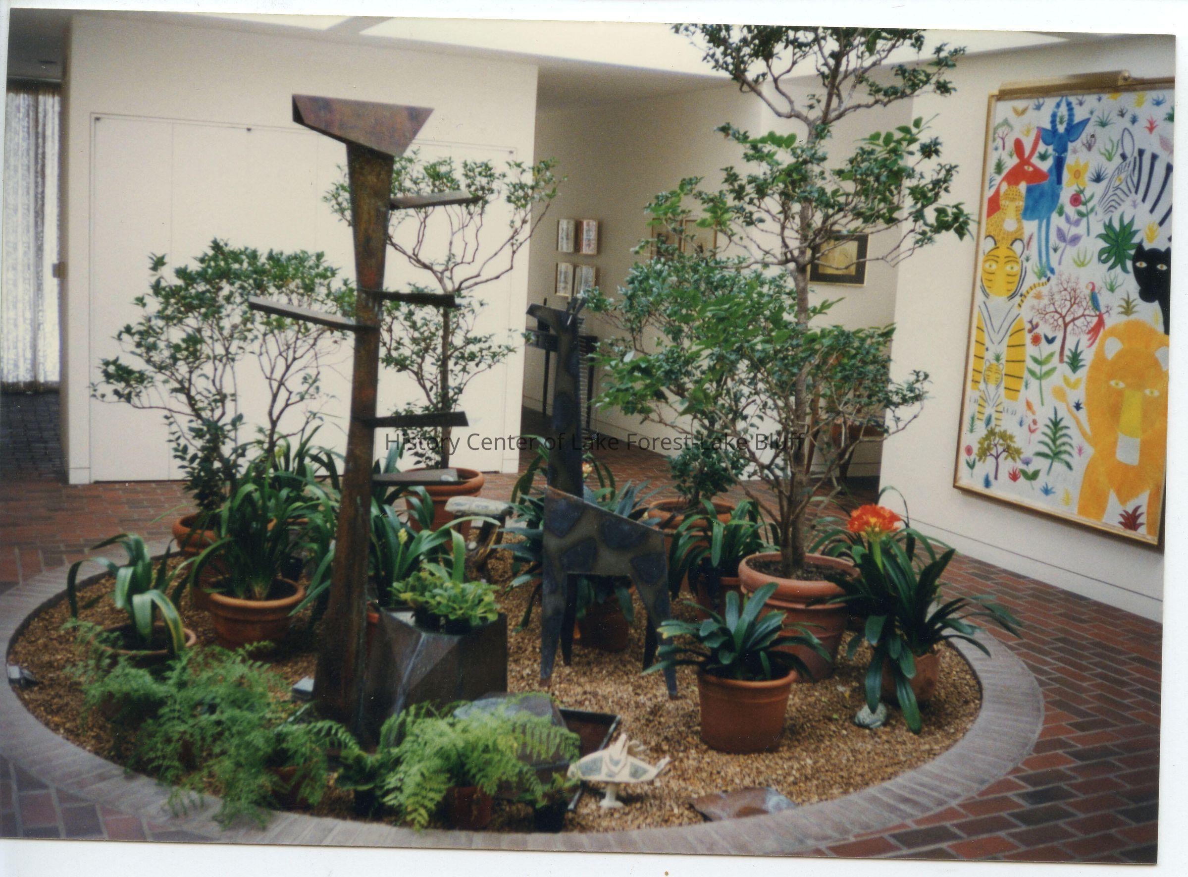 Interior of 480 North Green Bay Road. Interior garden, large, colorful artwork of animals on the wall.