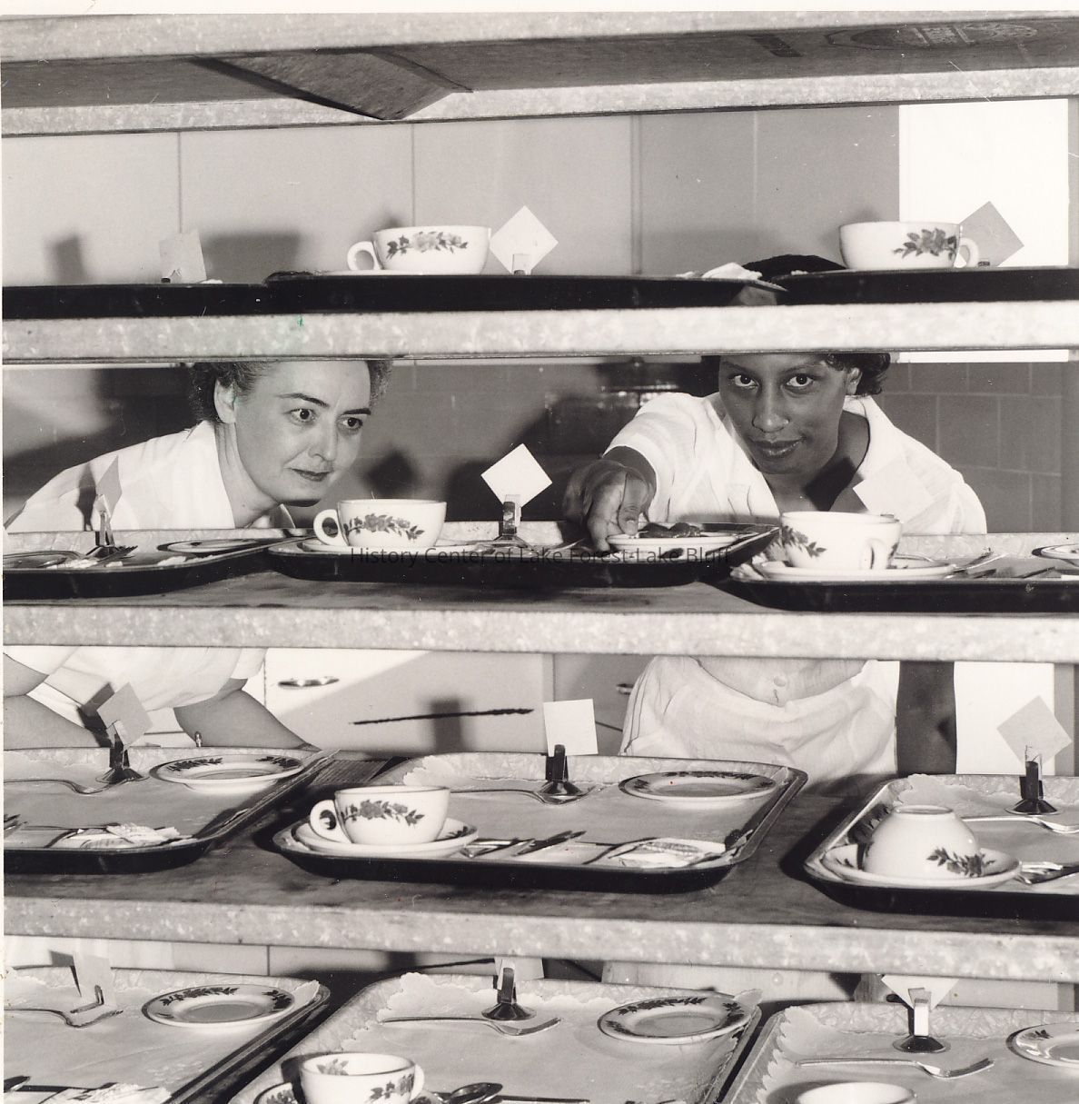Two women in a kitchen arrange trays with tea cups and plates neatly on shelves.