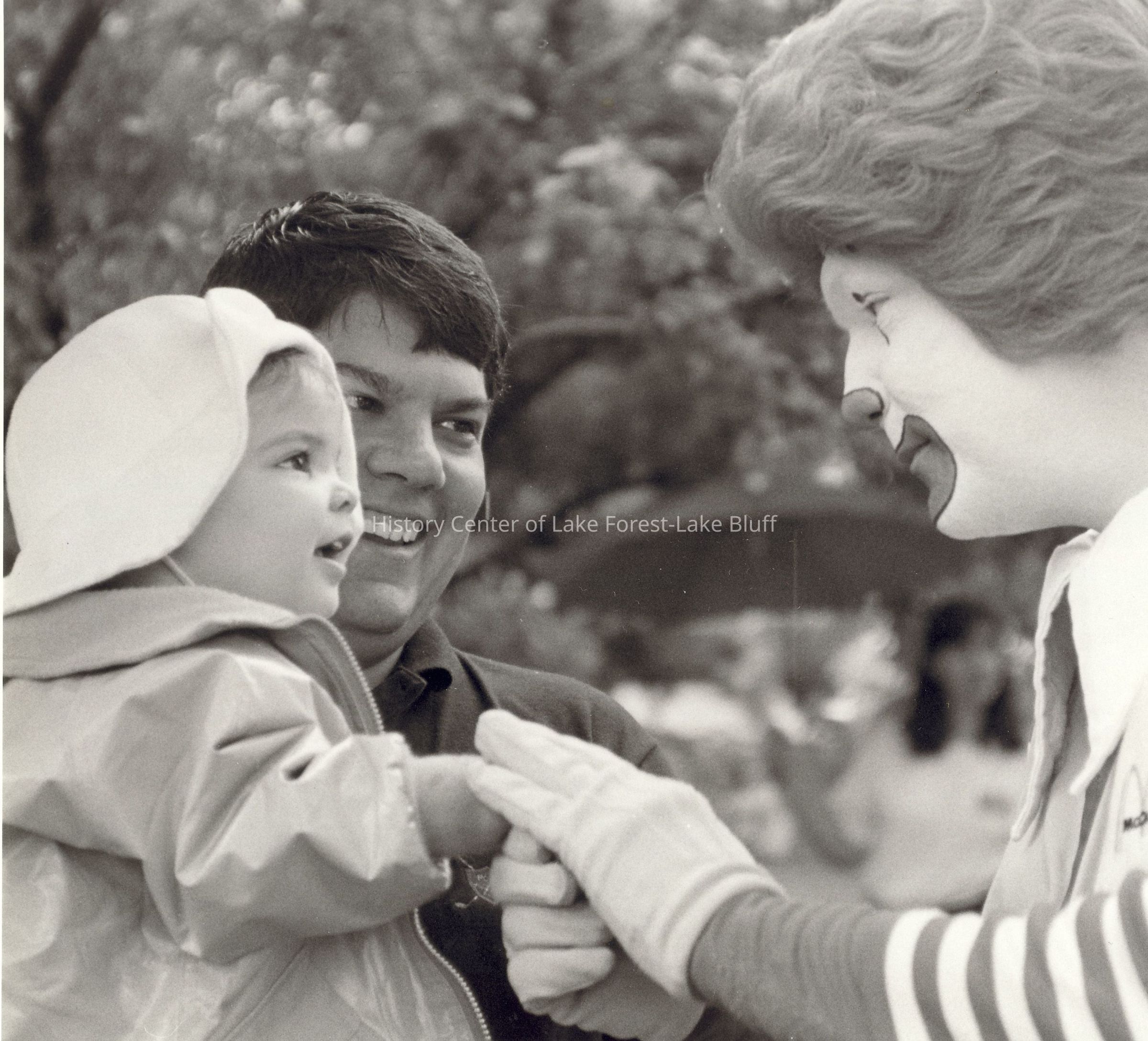 A man and child cheerfully greet a costumed clown (Ronald McDonald), sharing a joyful moment together outdoors.