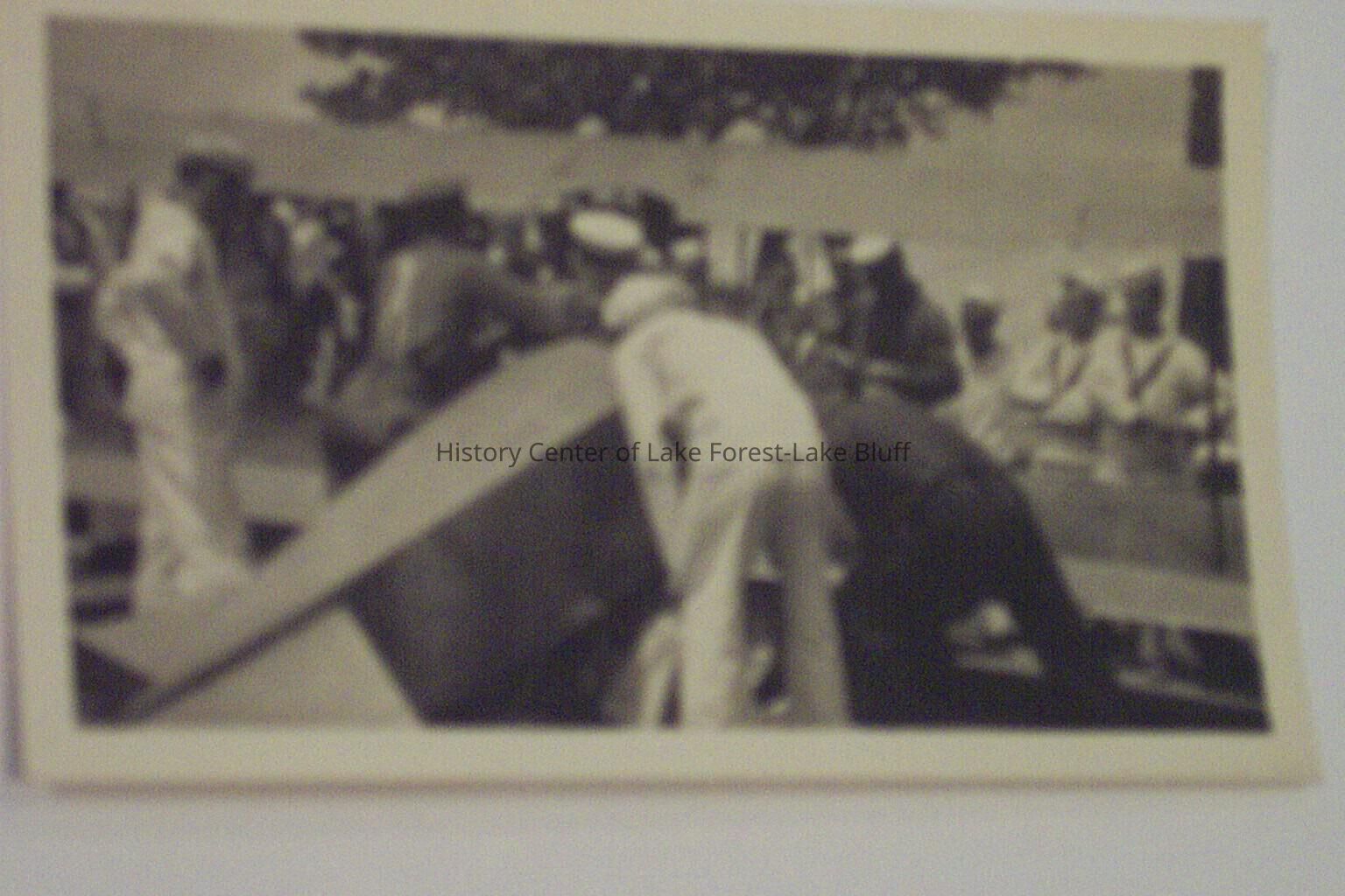 Group of men in summer uniforms looking at plane's tail in foreground.