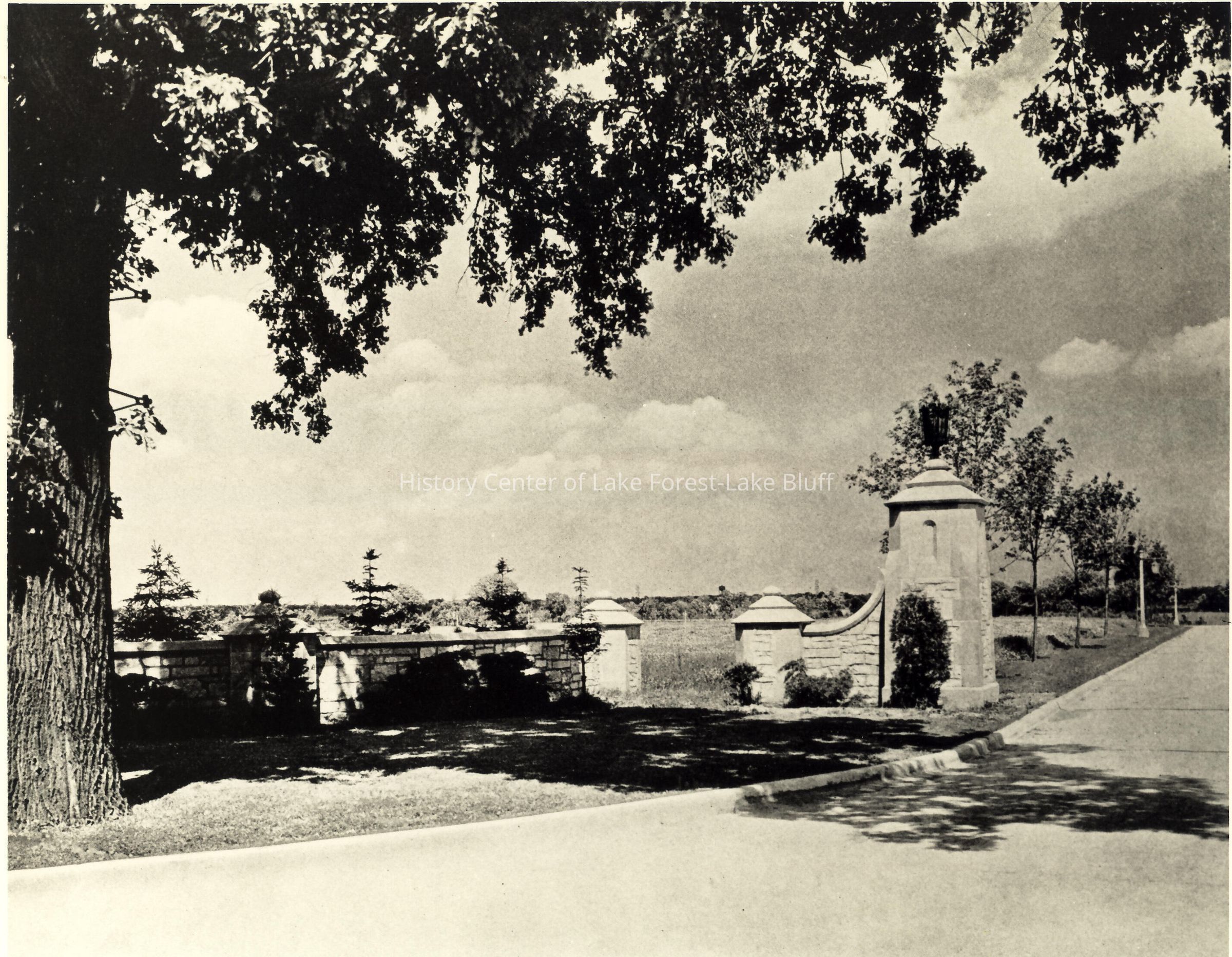 entrance gateway of Castlegate Court at Waukegan Road. This stone amenity was constructed as part of the Deerpath Hill Estates subdivision.