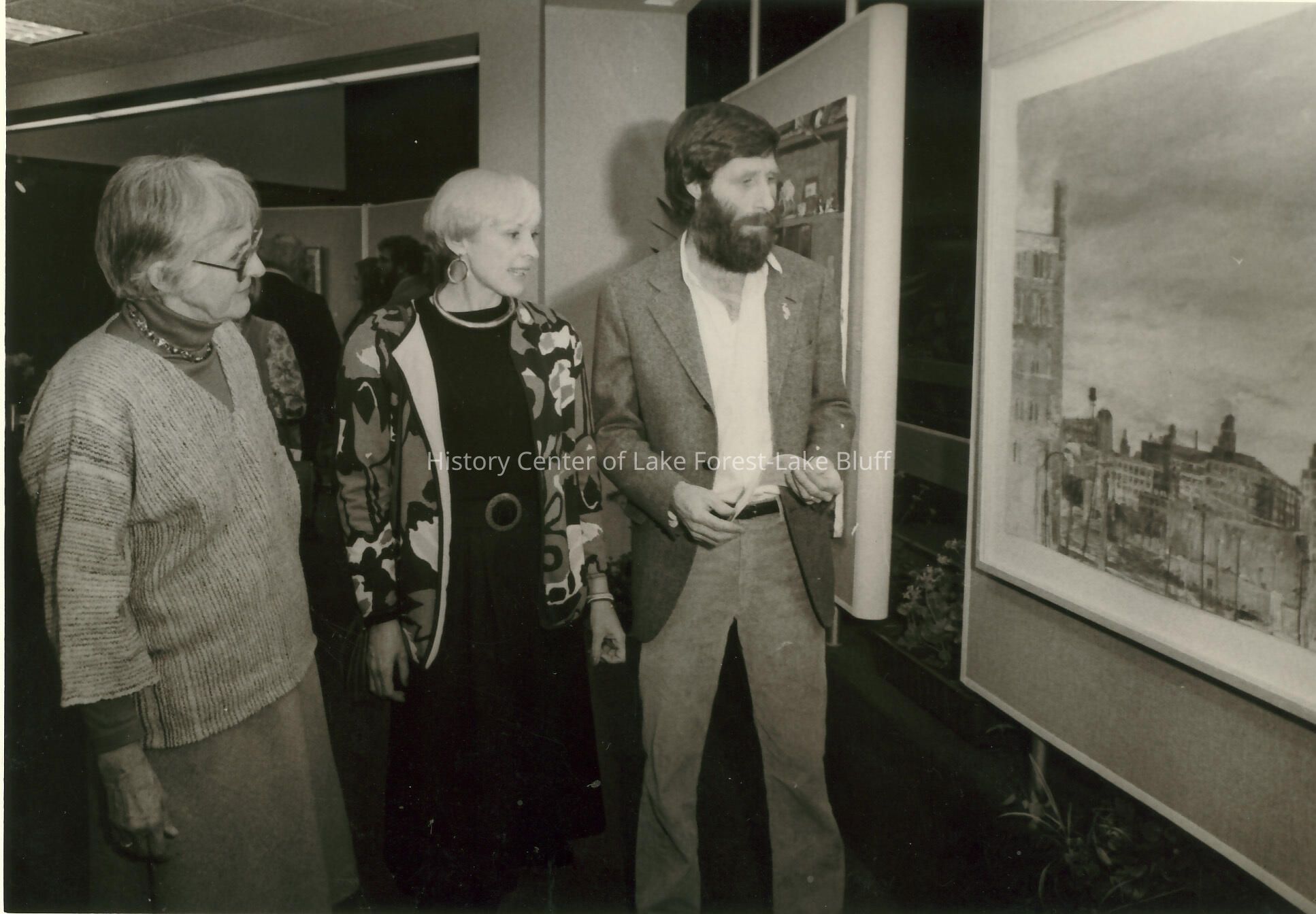Jim Geske show at Ragdale Alice Ryerson, Evadene Judge, and artist David Gibson looking at picture Picture printed in the News-Voice, 12/13/1986