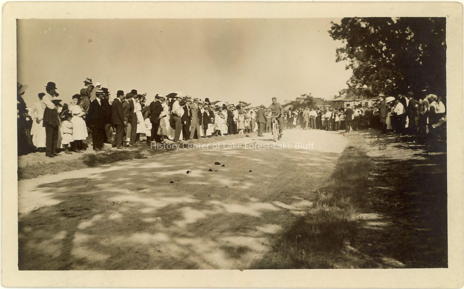 black and white postcard image of road with a parade? and bystanders. Unidentified event and location.