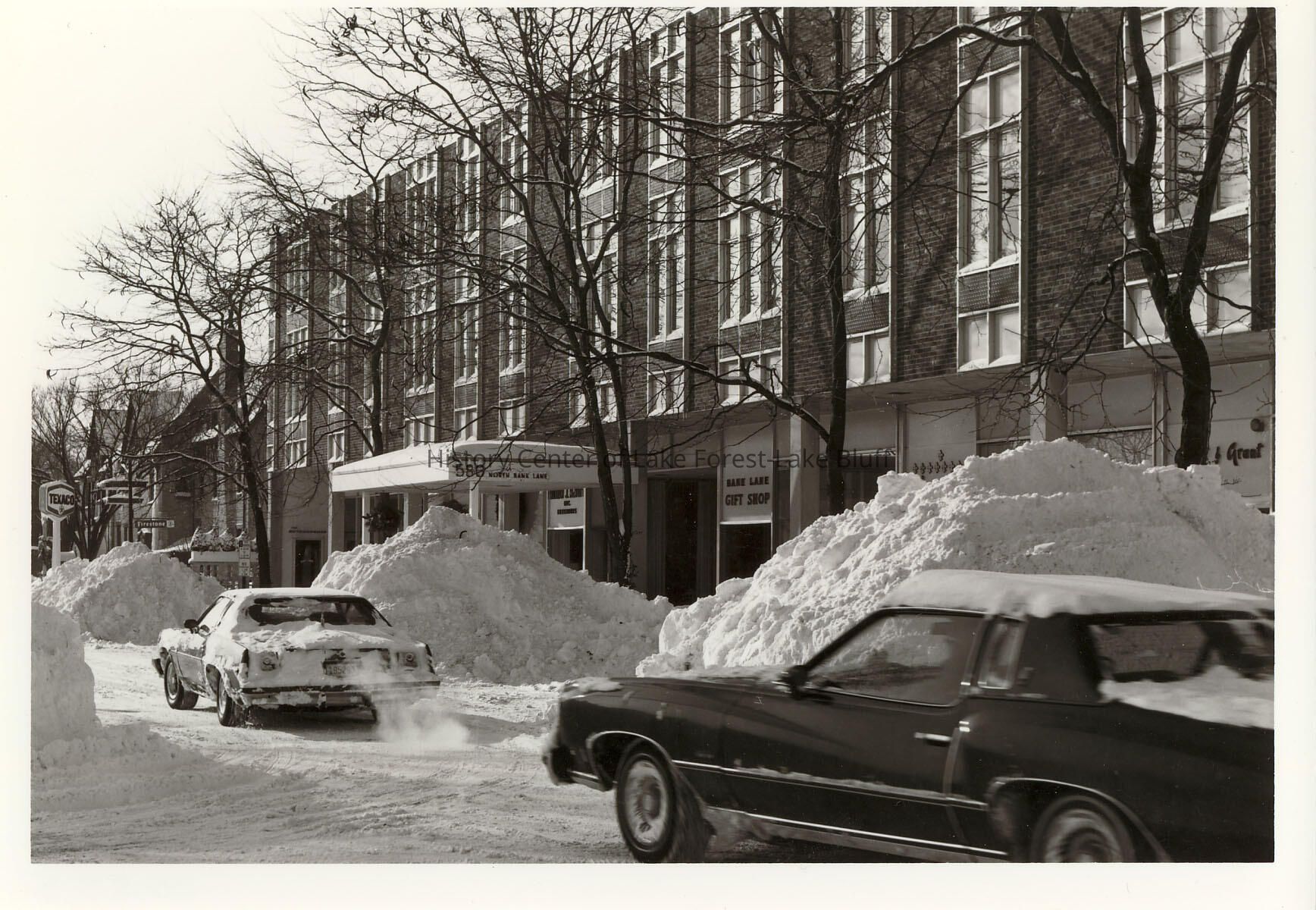 Photograph of businesses at 580 North Bank Lane, with two cars and 3 large snow banks outside. Taken after the blizzard of January, 1979. Visible businesses include: Texaco gas station, The Outdoorsman, Bank Lane Gift Shop, Grant and Grant, Inc. (586 North Bank Lane)
