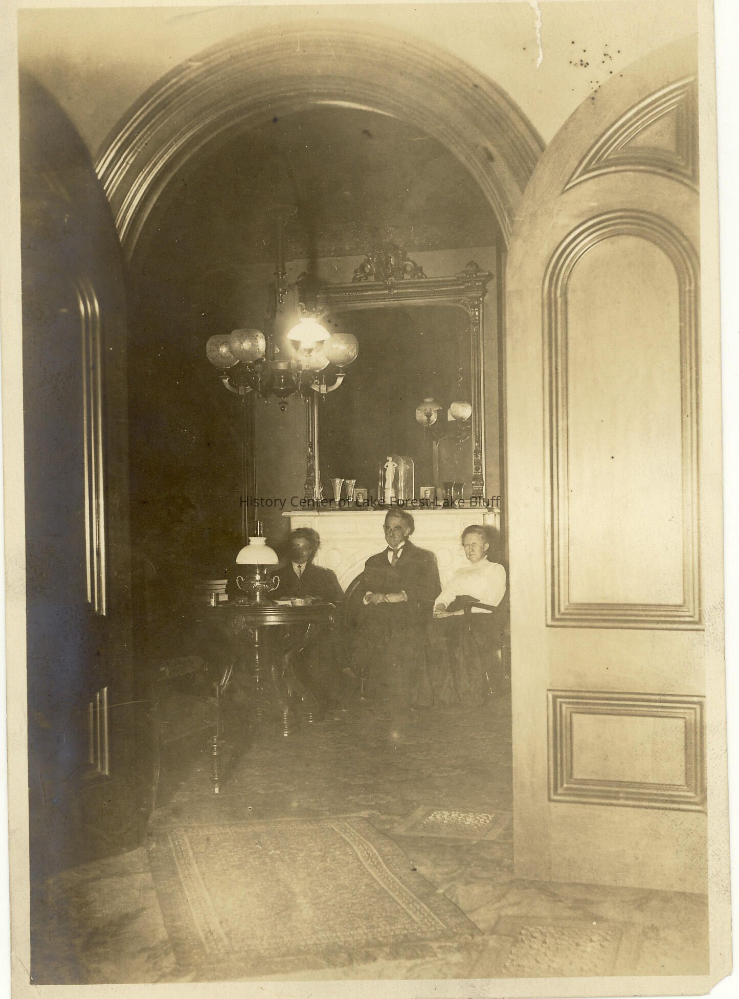 A large curved doorway with 2 men and a woman sitting in the next room. Harvey Family of Lake Bluff ?