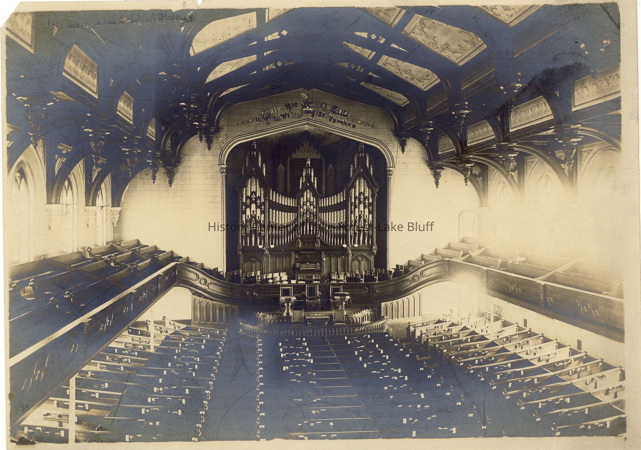 A view of the pipe organ in a large cathedral, unknown location