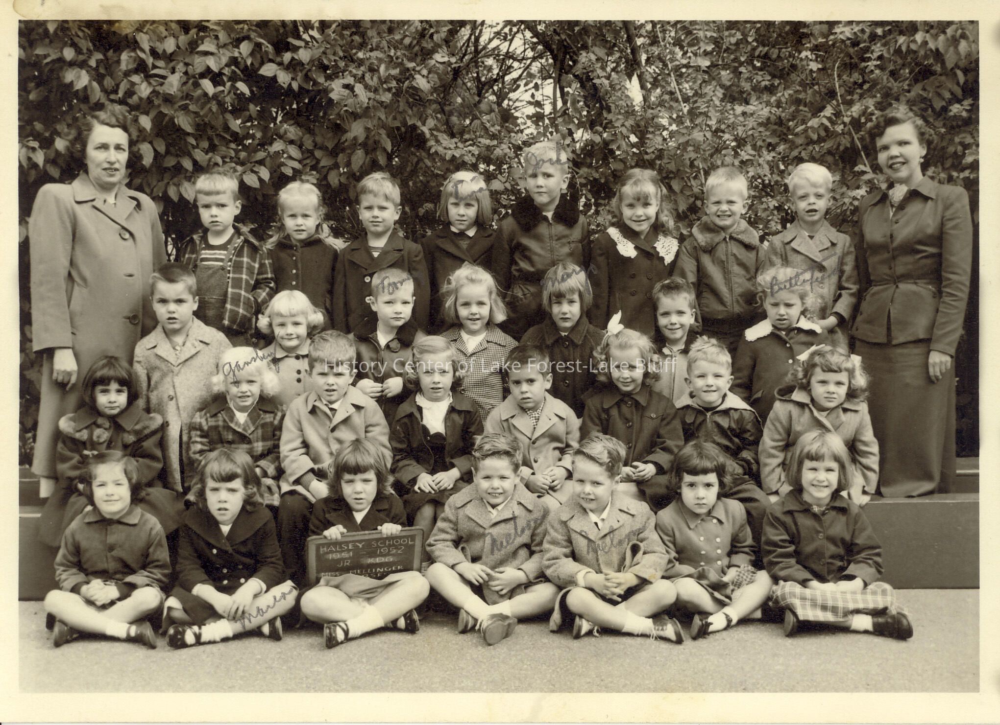 Class Photo given by Margaret Sneddon Larsen. Halsey School Junior Kindergarten class 1951- 1952. teachers: Miss Mellinger (on right in suit), Mrs. Larsen (on left in coat)
