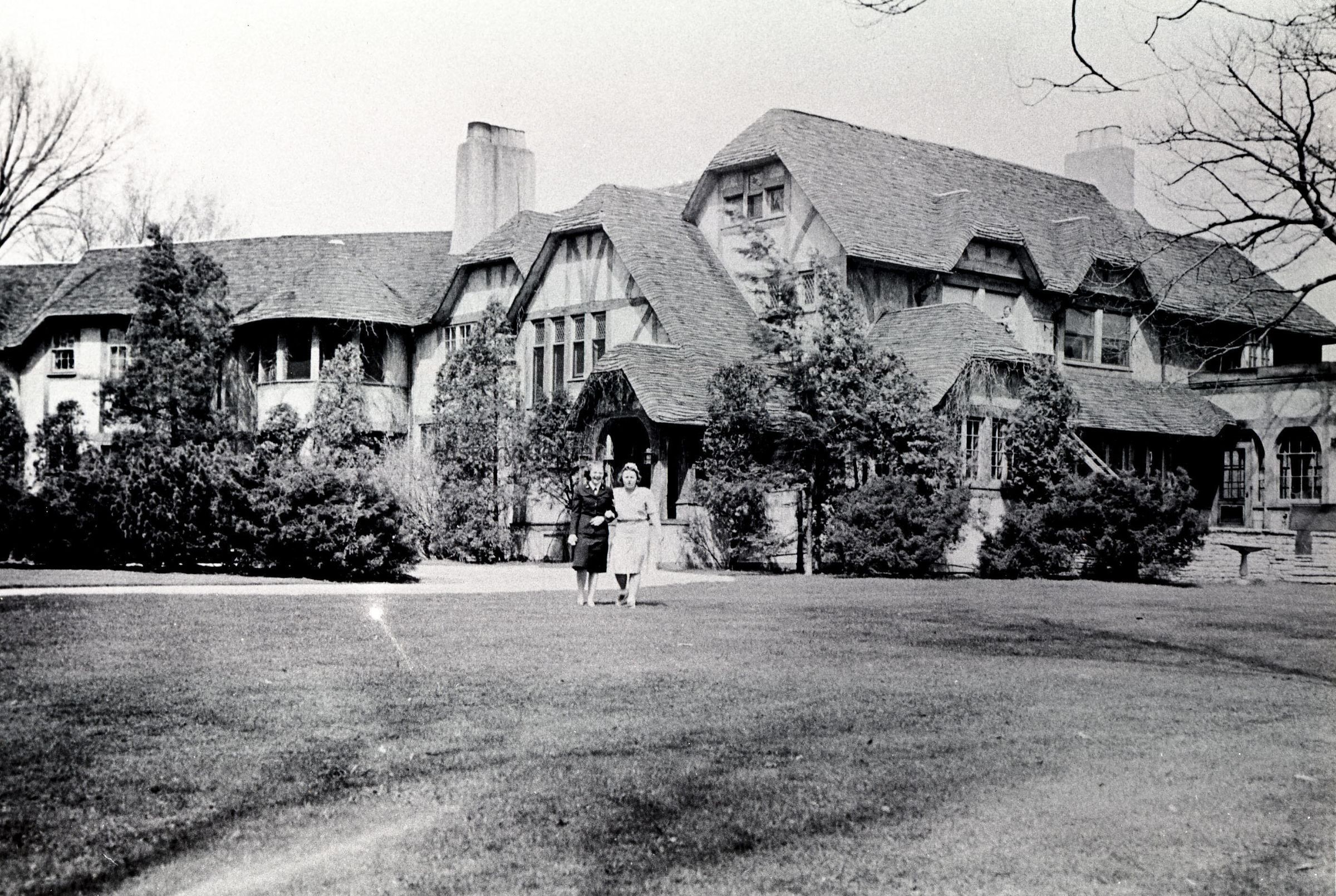 Black and white photograph of 614 East Spruce from the 1940s. 550 East Spruce was the address before the estate was subdivided. Photo shows the facade of the Cyrus McCormick III manor house in the 1940s when James E. Baum was the owner of the home. Photo shows Gerda Hansen Verbeke and Henrietta Prizmus.