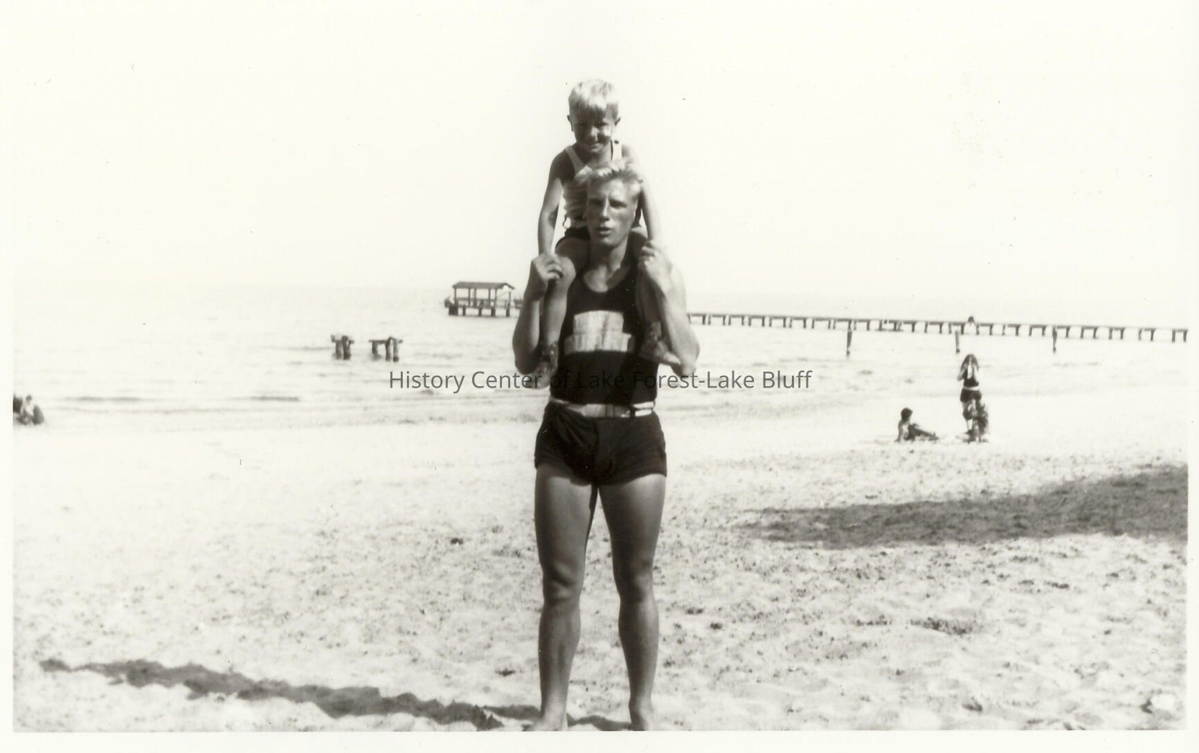Edgar Gleiser sitting on life guard Oliver Lindemeyer's shoulders at Lake Forest beach.