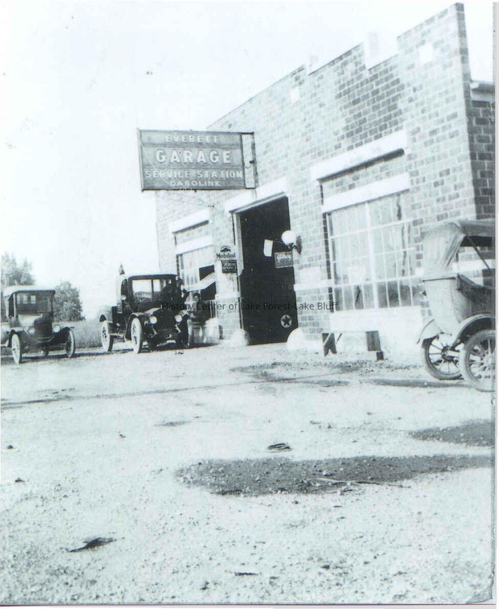 Everett Garage owned by the Liefer Brothers at 1045 South Waukegan Road, shown from the side with 3 cars in the front. Sign is perpendicular to the building.
