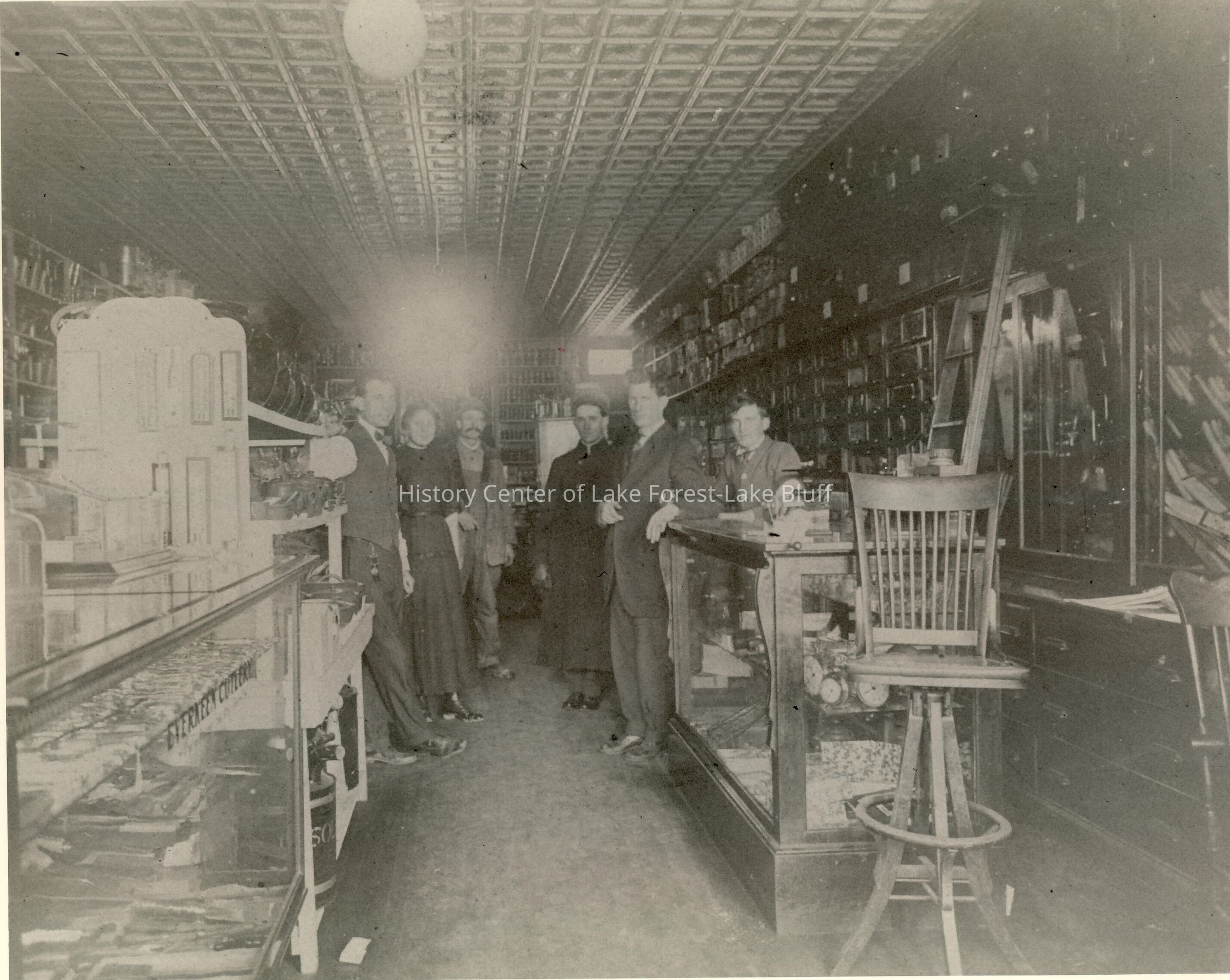 672 North Western Avenue Lake Forest Approximately Harder and Keuper's Store site of Community Grocery Store 1913 1. Frank Keuper 2. Mrs Wm. Burgess (Ethel Leaf) 3. Wm. Frisbie 4. Edward Dunn 5. Thos. Horan 6. Stanley Kiddle