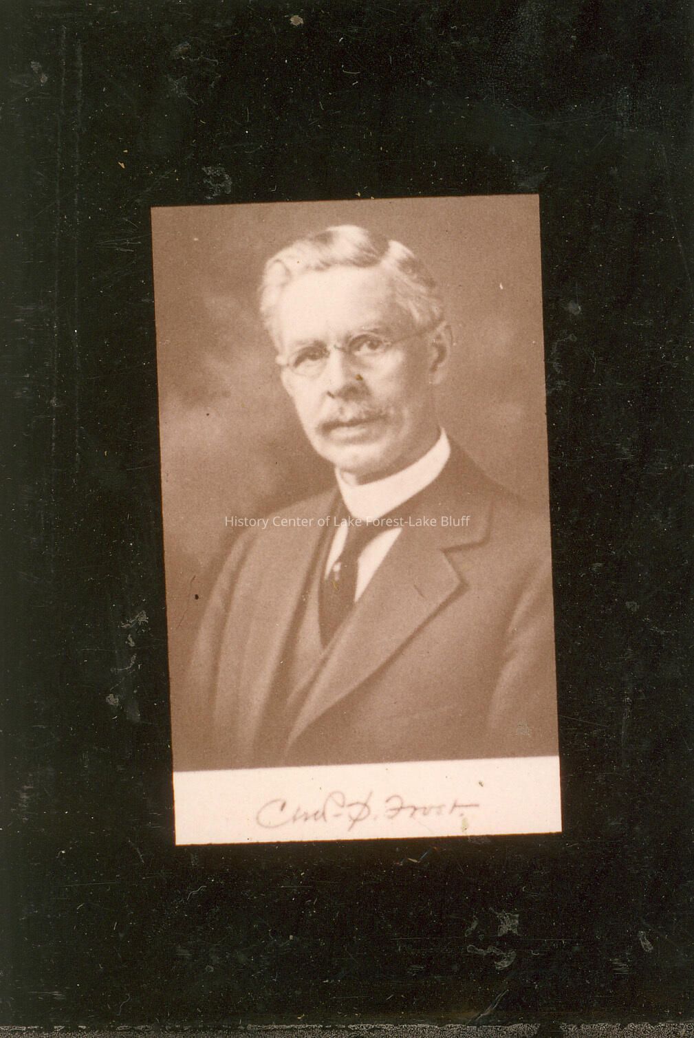 Encapsulated photo print of Charles Sumner Frost, architect (1856-1931). Part of the firm Cobb and Frost (1882-1898) with Henry Ives Cobb, and the firm Frost and Granger with Alfred Hoyt Granger. Designed many Lake Forest buildings including the train station.